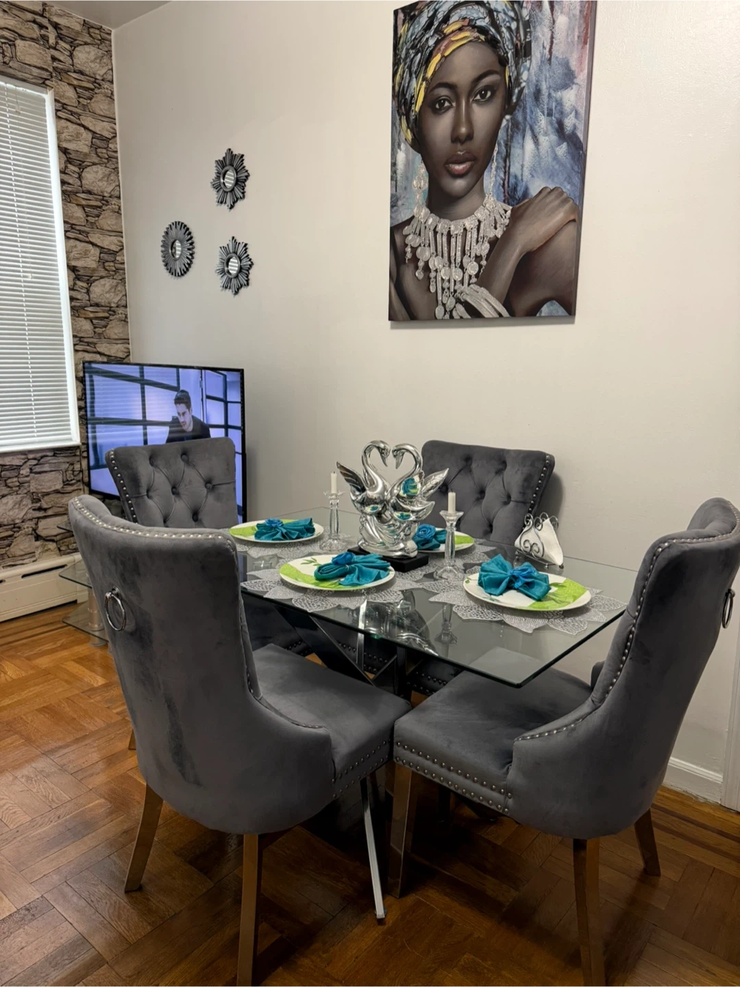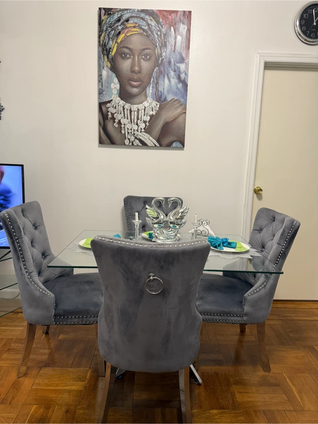 Selling a dining table set that includes a glass-top table and four stylish gray velvet chairs. The chairs feature a tufted design and silver-colored accents. This set would be a great addition to any dining room or kitchen area!