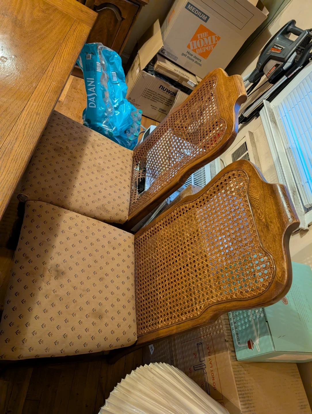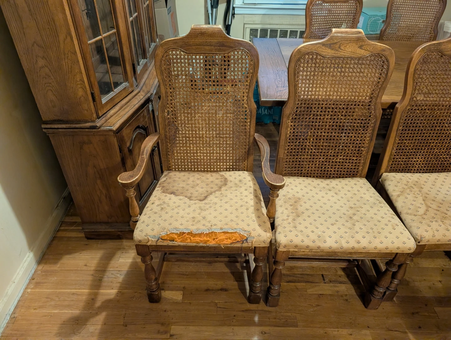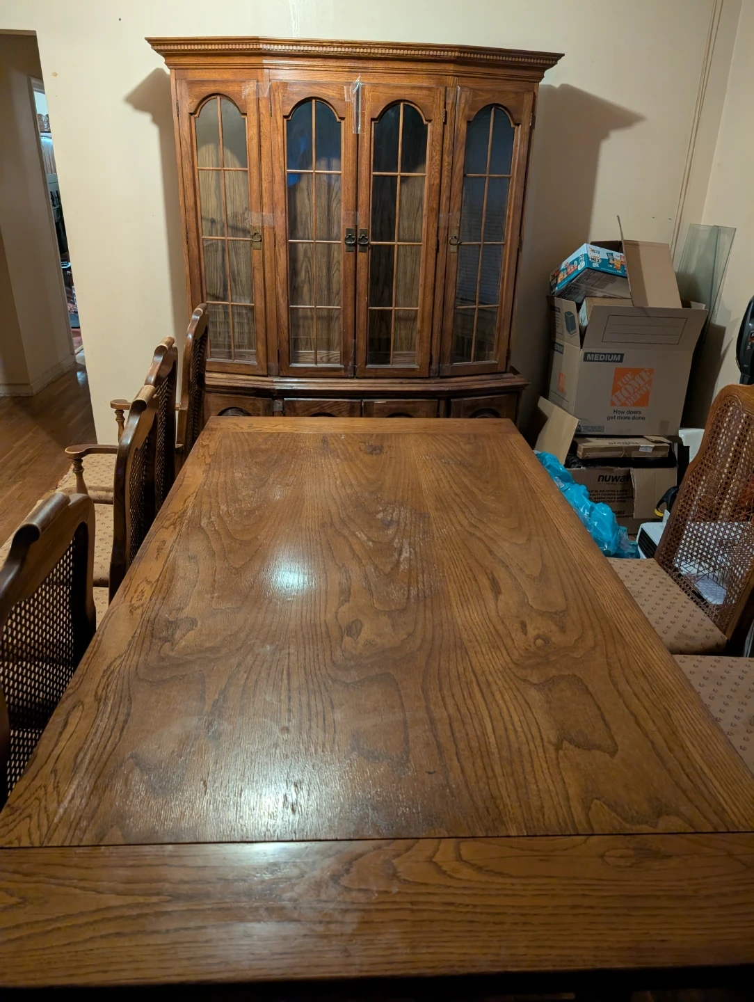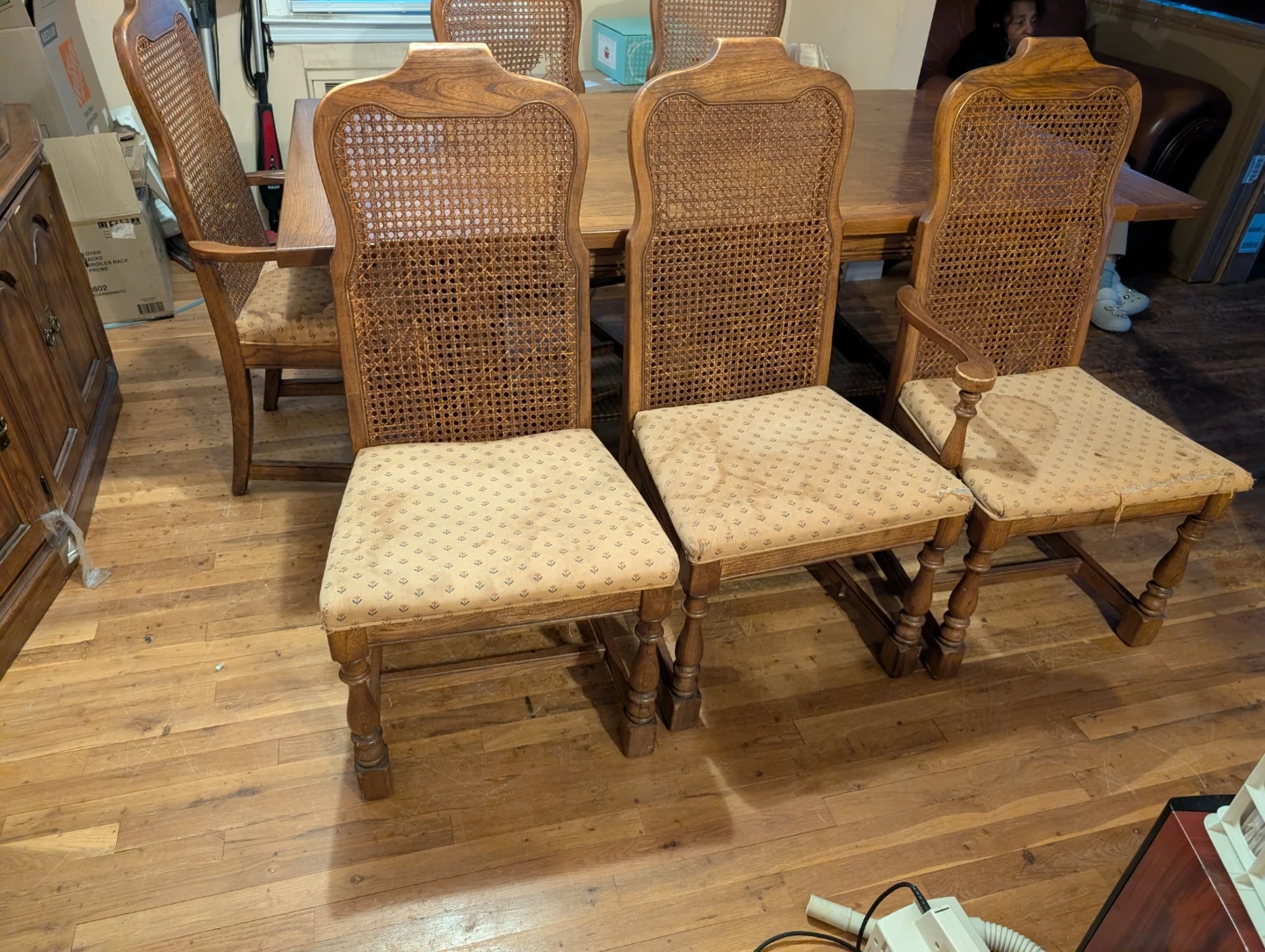 78Selling a complete dining table set! Includes a large wooden dining table, a hutch for storage and display, and six matching chairs with woven backs.it's a DIY refurbished dream. The 6 chairs are optional and in need of repair. The set has a classic, elegant look and would be great for family meals or entertaining just in time for thanksgiving gatherings..