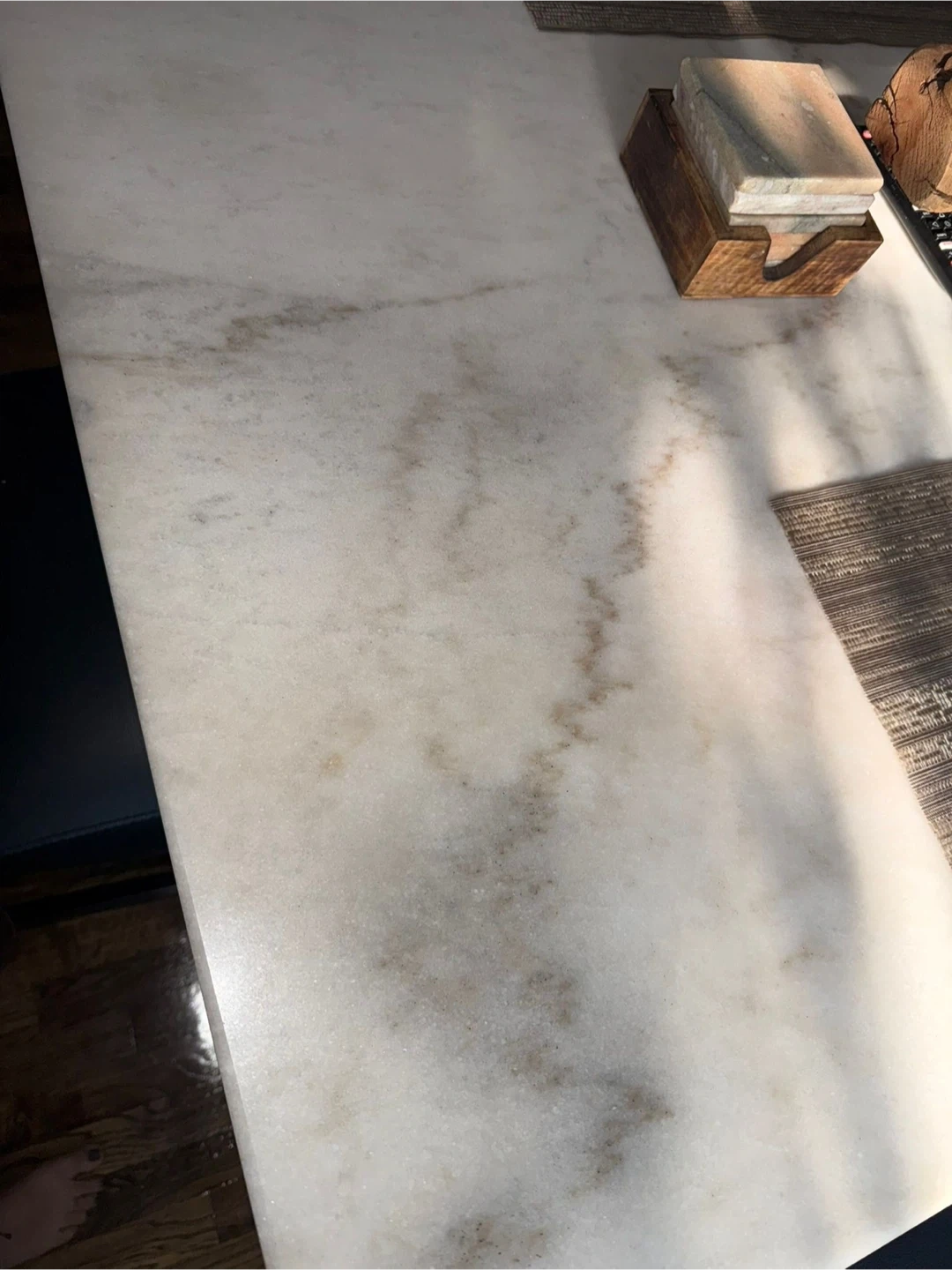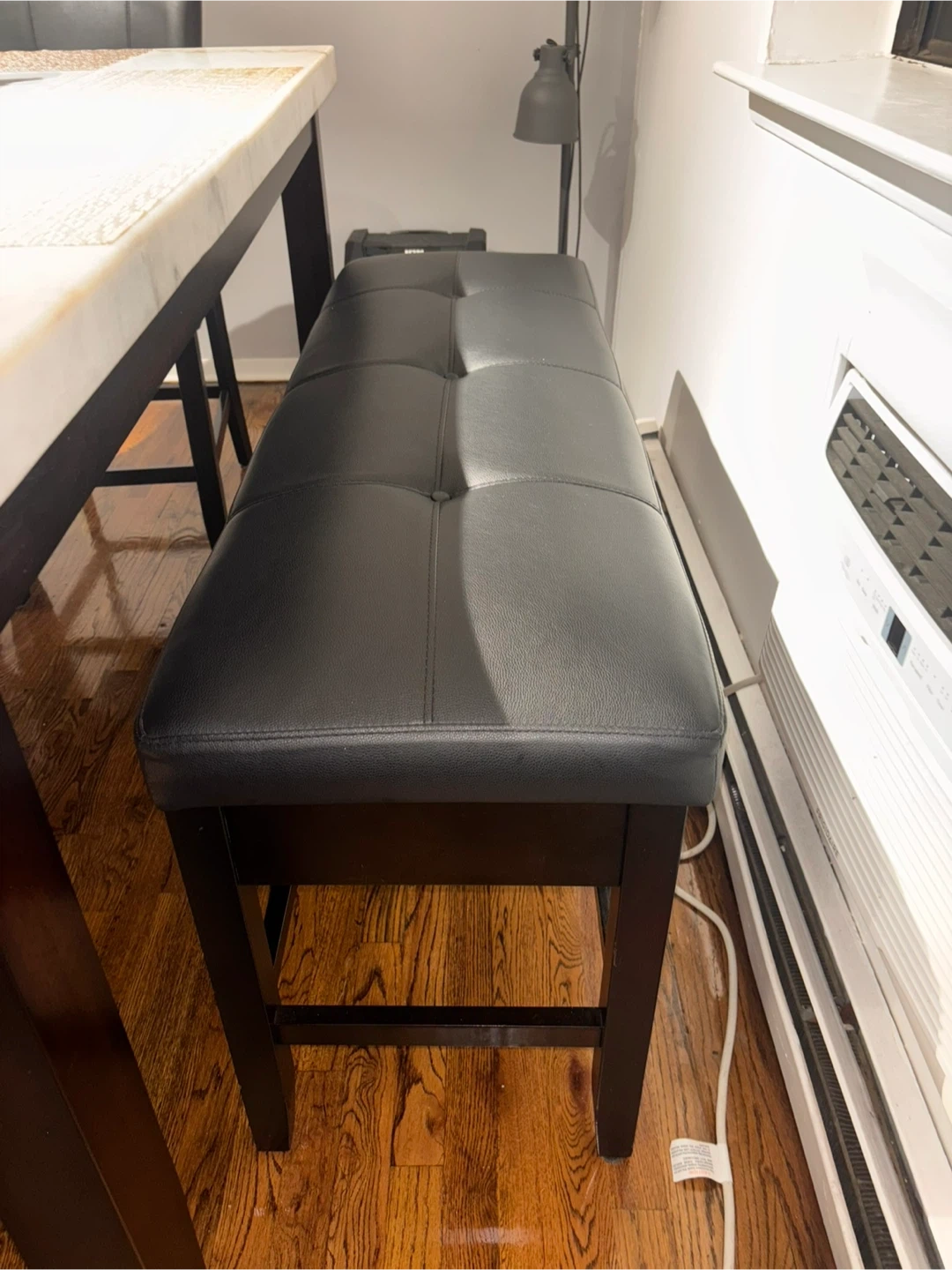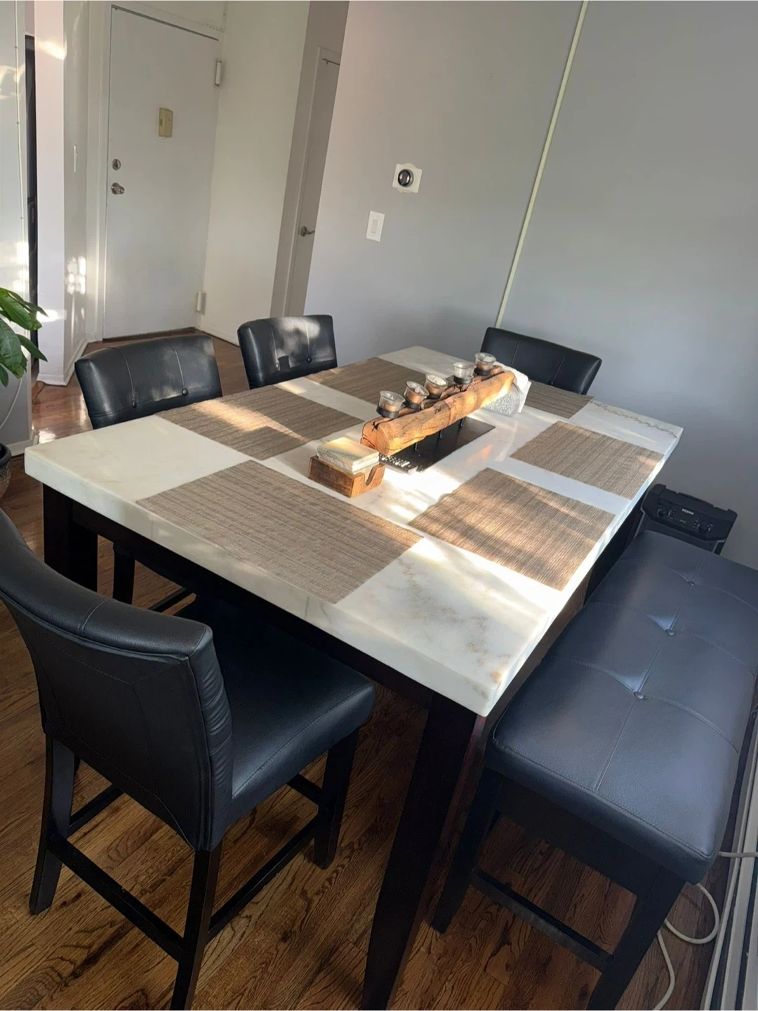 Selling a dining table with four chairs and a bench. The table has a unique marble-like top, and the chairs and bench are black. It's a great set for any dining room!