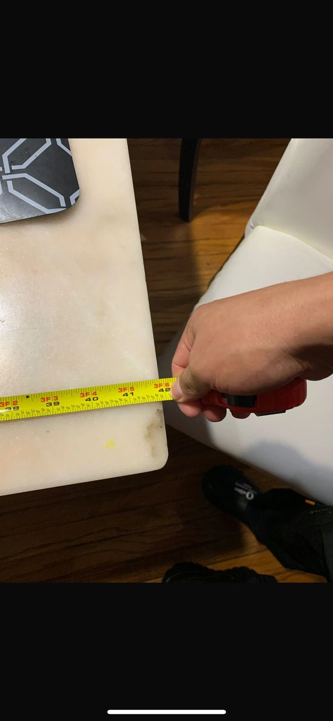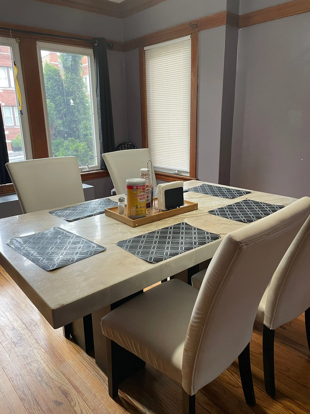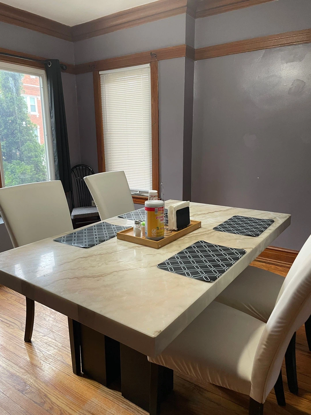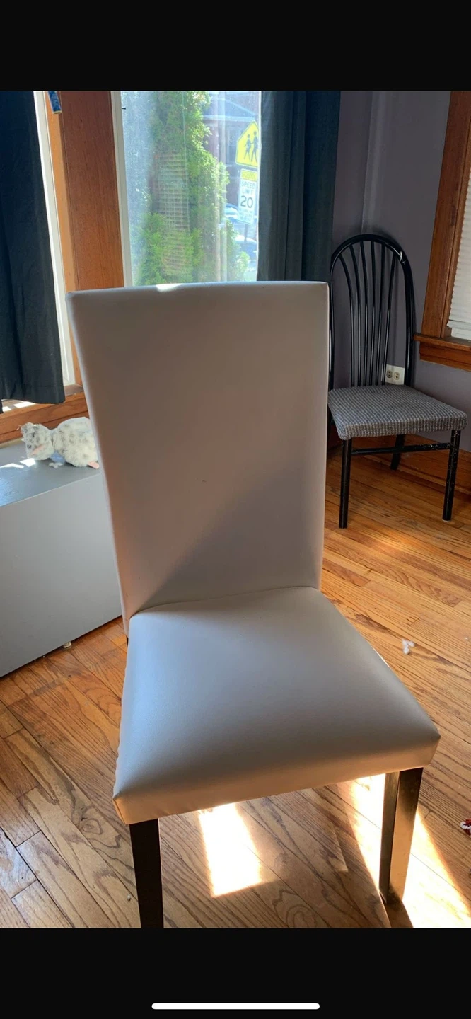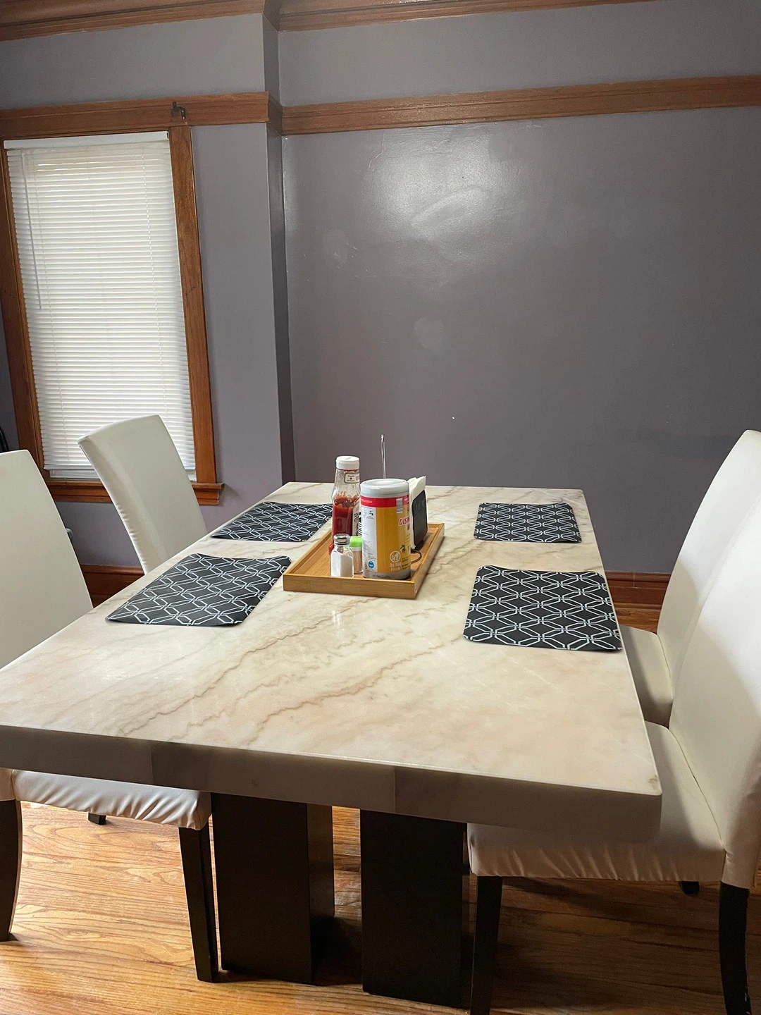 5Dining table with four chairs. The table is 70 inches long and 41 inches wide. Chairs are white.