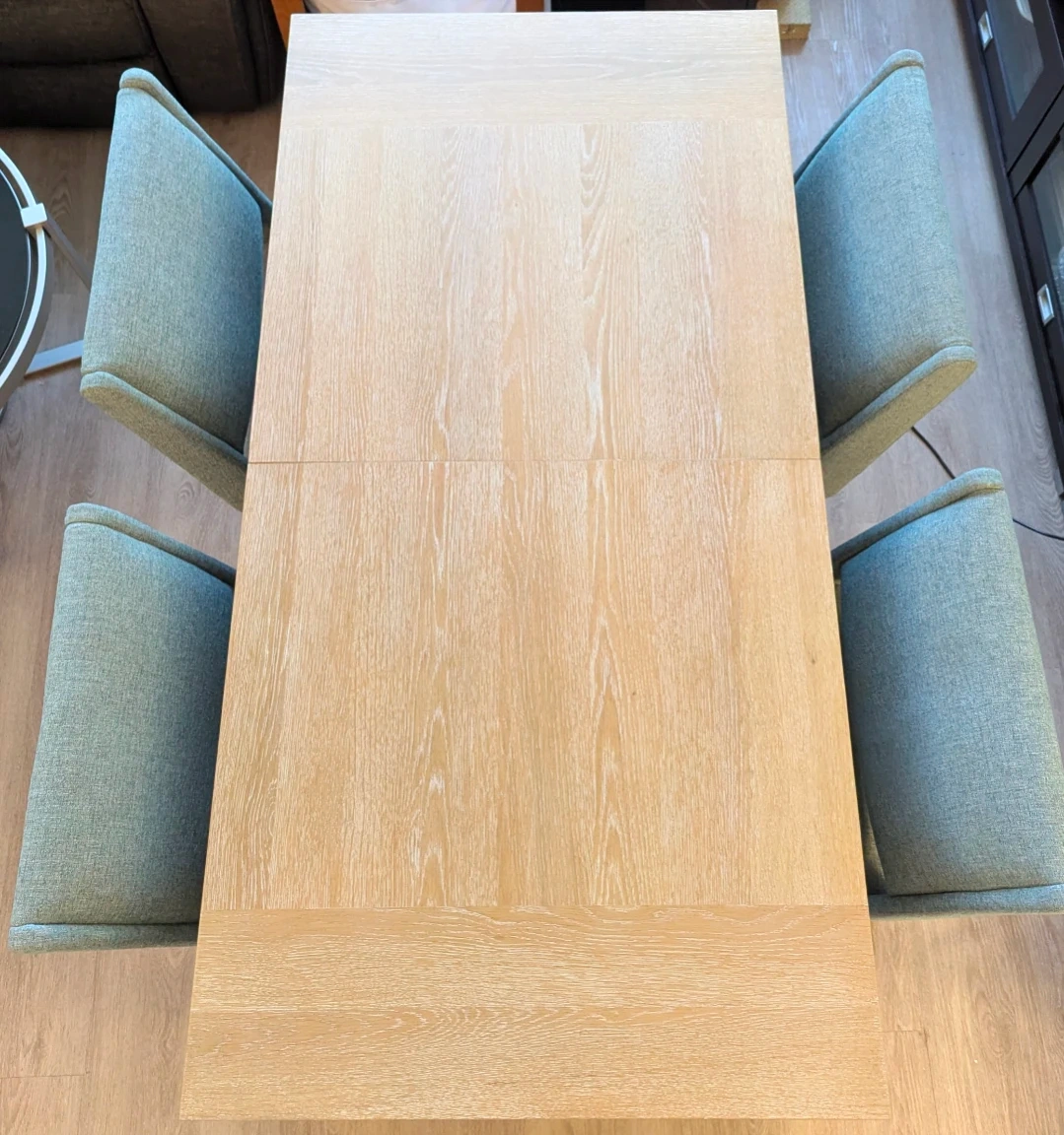 Selling a dining table with four matching chairs. The table is a light wood finish, and the chairs are upholstered in a nice blue fabric. It's a great set for a smaller dining area! Table has a leaf that pops out from under and adds 14" to the length.