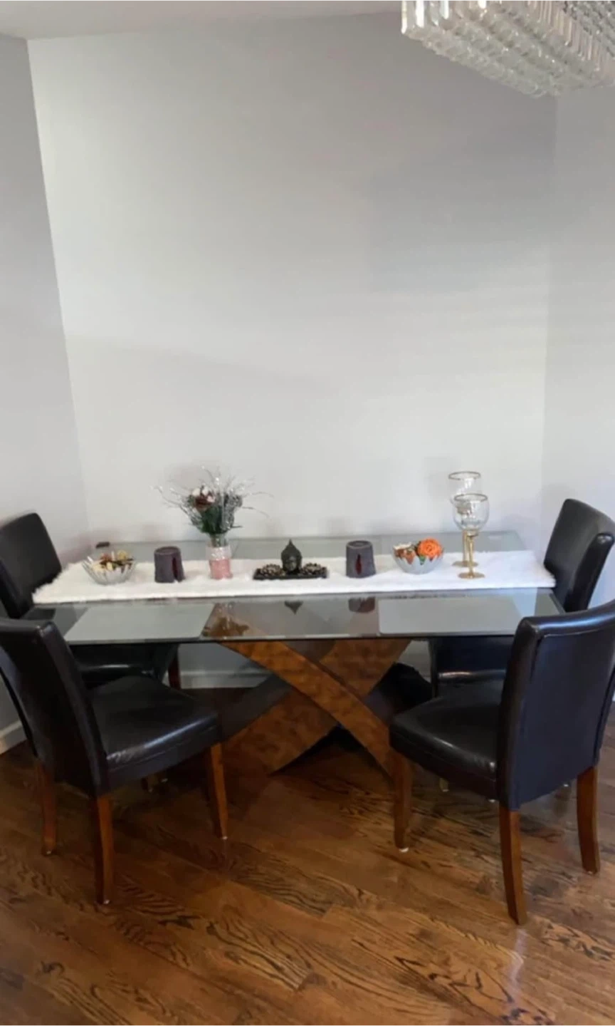 Selling a dining table with 4 matching leather chairs. The table has a glass top and a unique wooden base. The chairs are brown leather. Great for a dining room or kitchen area