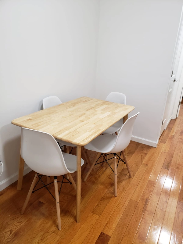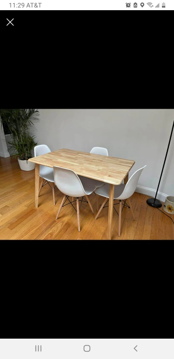 Selling a dining table that comes with four white chairs. The table has a light wood color and a simple, modern design. It's perfect for a small dining area or kitchen nook. Great condition and ready for a new home!