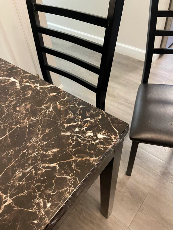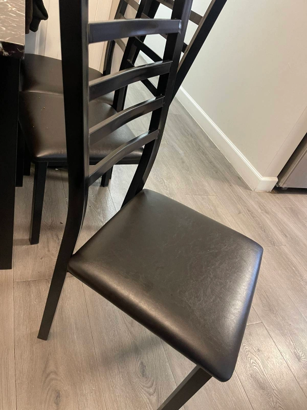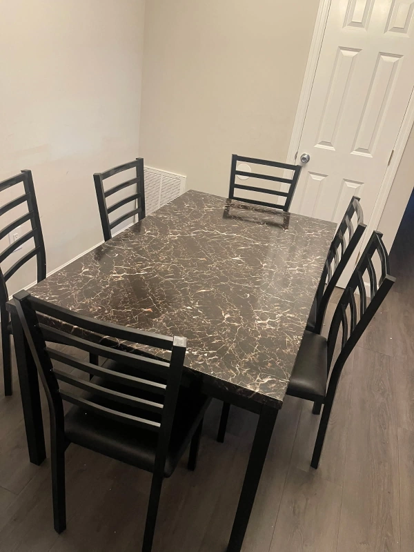 Selling a dining table with six chairs. The table has a marble-patterned top and black legs. The chairs are black with a ladder-back design and padded seats. It's in good condition and ready for a new home! Just you need to pick up from my location. Call or text at 9174807839