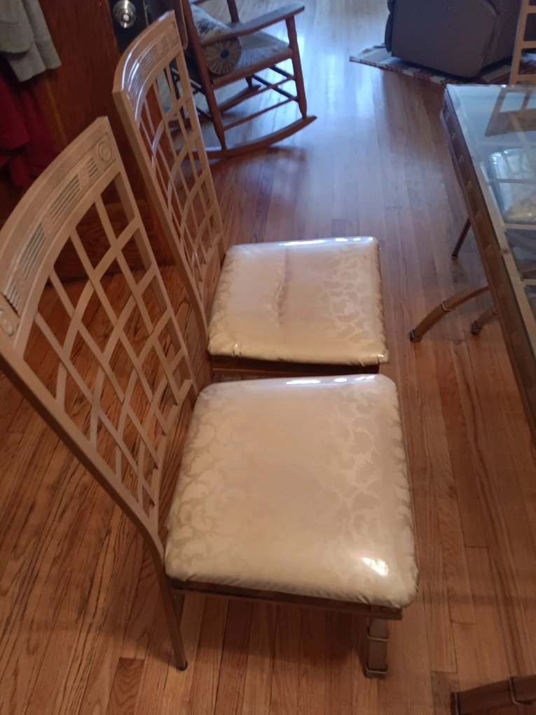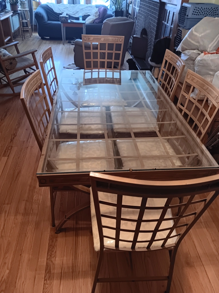 Selling a dining table with six chairs. The table has a glass top and a metal frame. The chairs have a lattice back design and cushioned seats. It's in good condition and ready for a new home