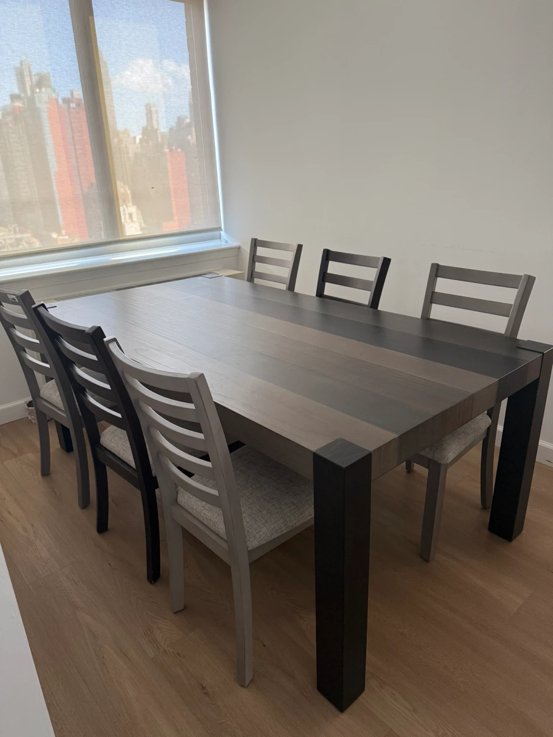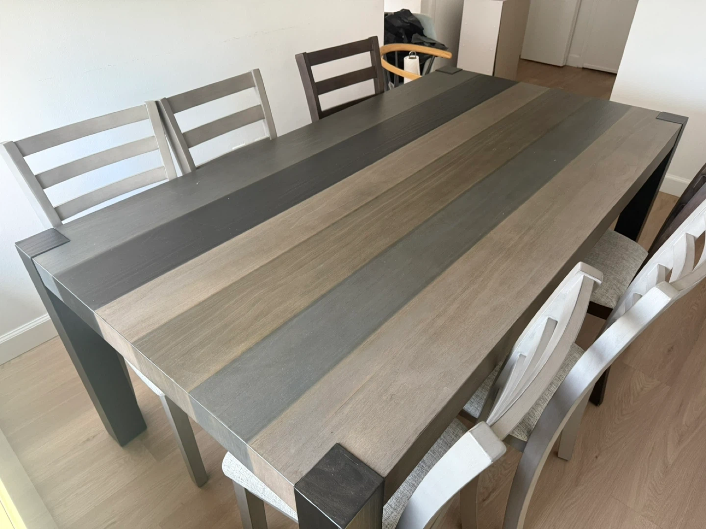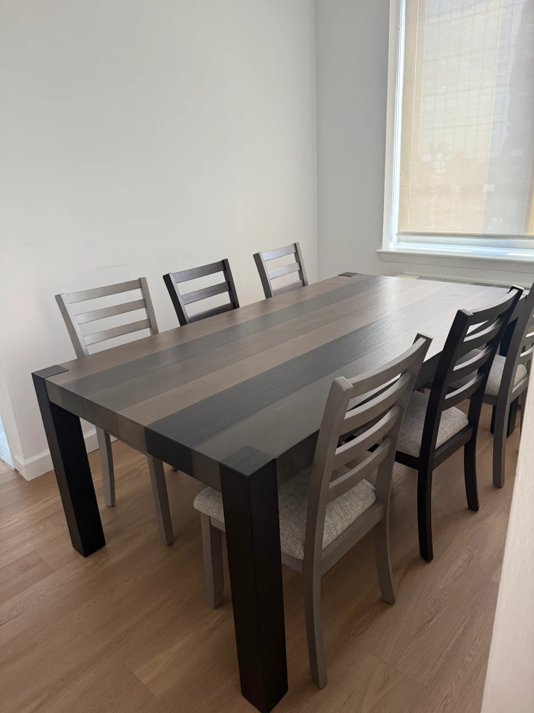 Selling a dining table with six chairs. The table has a unique design with varying shades of wood. The chairs are a mix of gray and dark wood with light gray fabric seats. Perfect for a dining room or large kitchen!