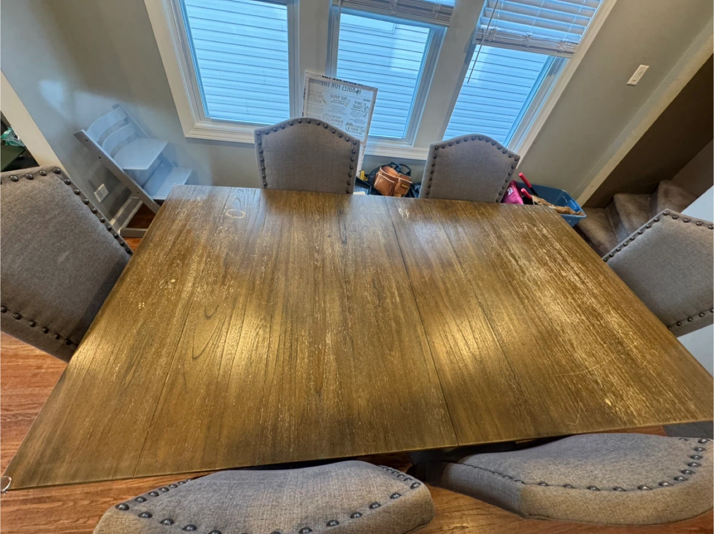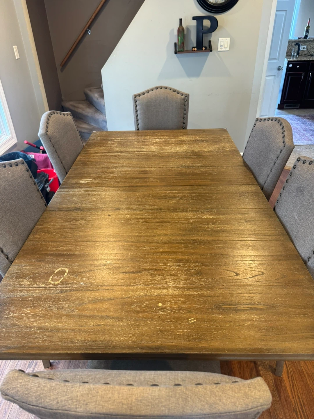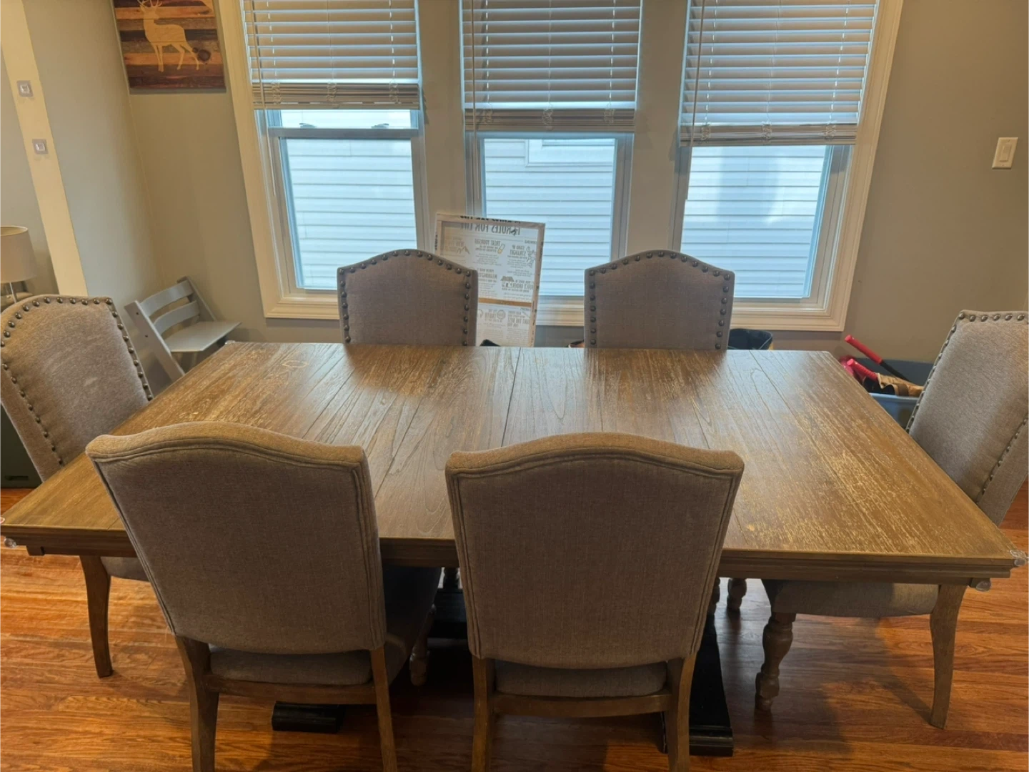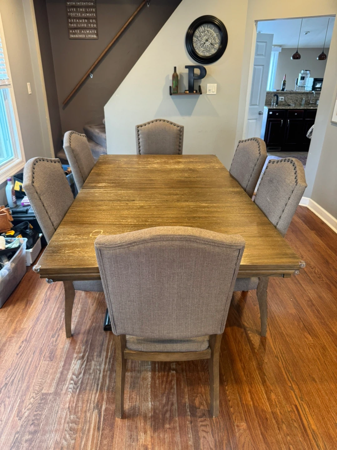 Selling a dining table with six chairs. The table is wood, and the chairs are upholstered in a neutral gray fabric. It's a great set for family meals or entertaining, It has an extension for the table.