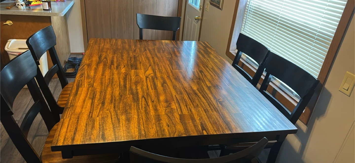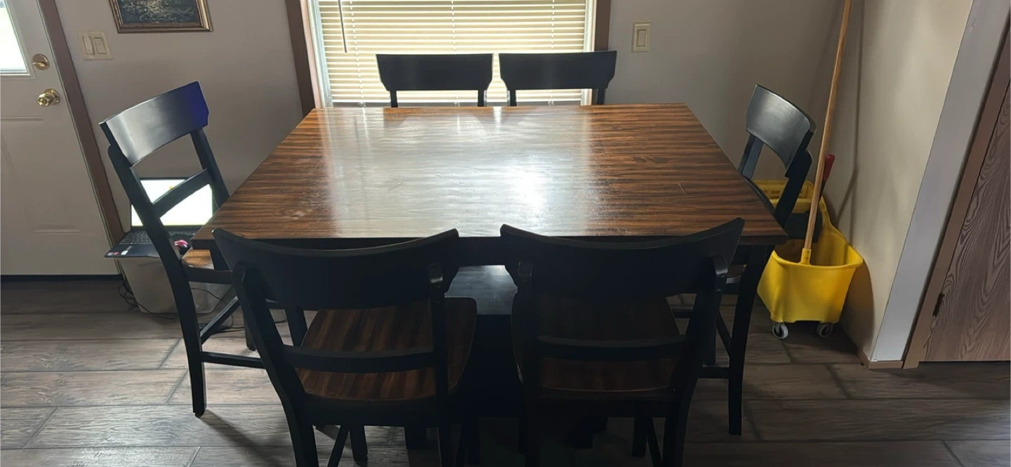 Here's a dining table with six chairs. It's made of wood and features a rich, dark finish. The table has a unique design with a storage cabinet built into the base. Perfect for family meals or gatherings!
