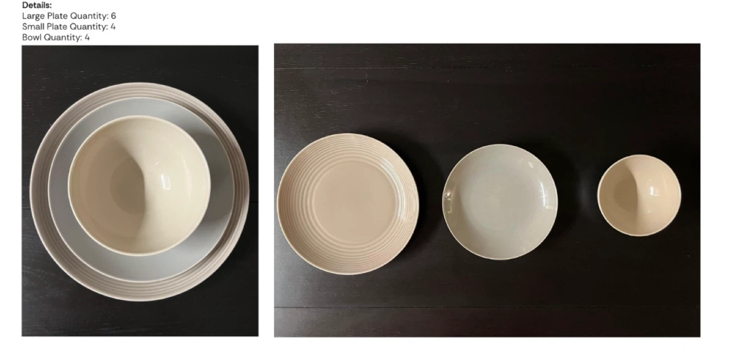 Selling a dinnerware set that includes 6 large plates, 4 small plates, and 4 bowls. Perfect for everyday use or special occasions! The set is in great condition and ready for a new home