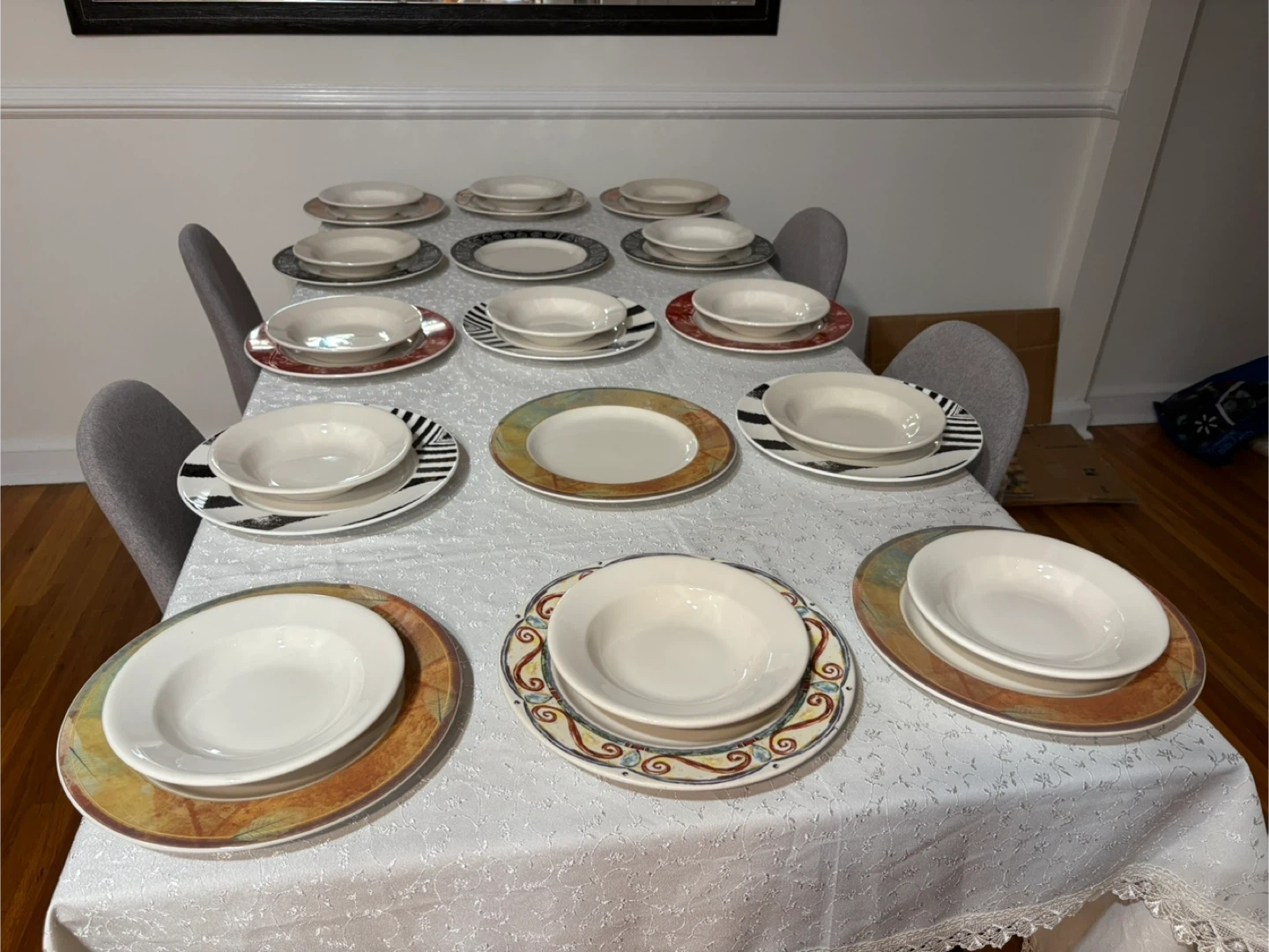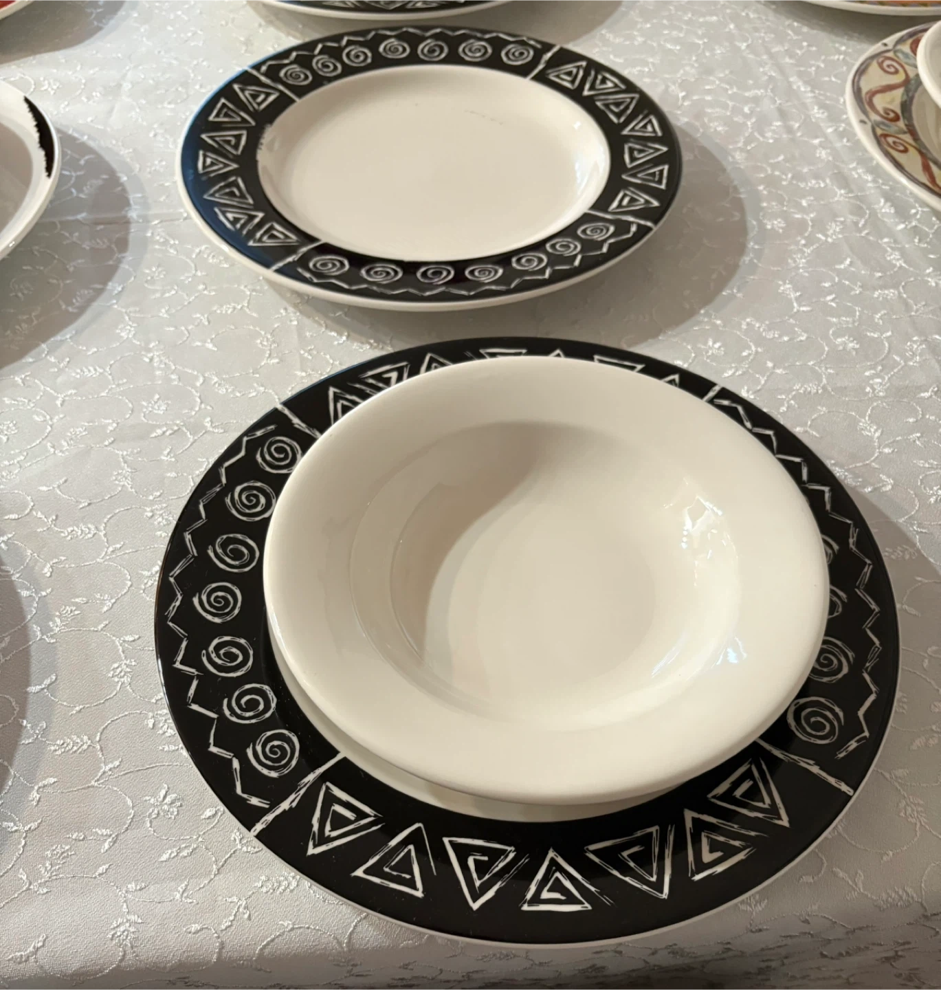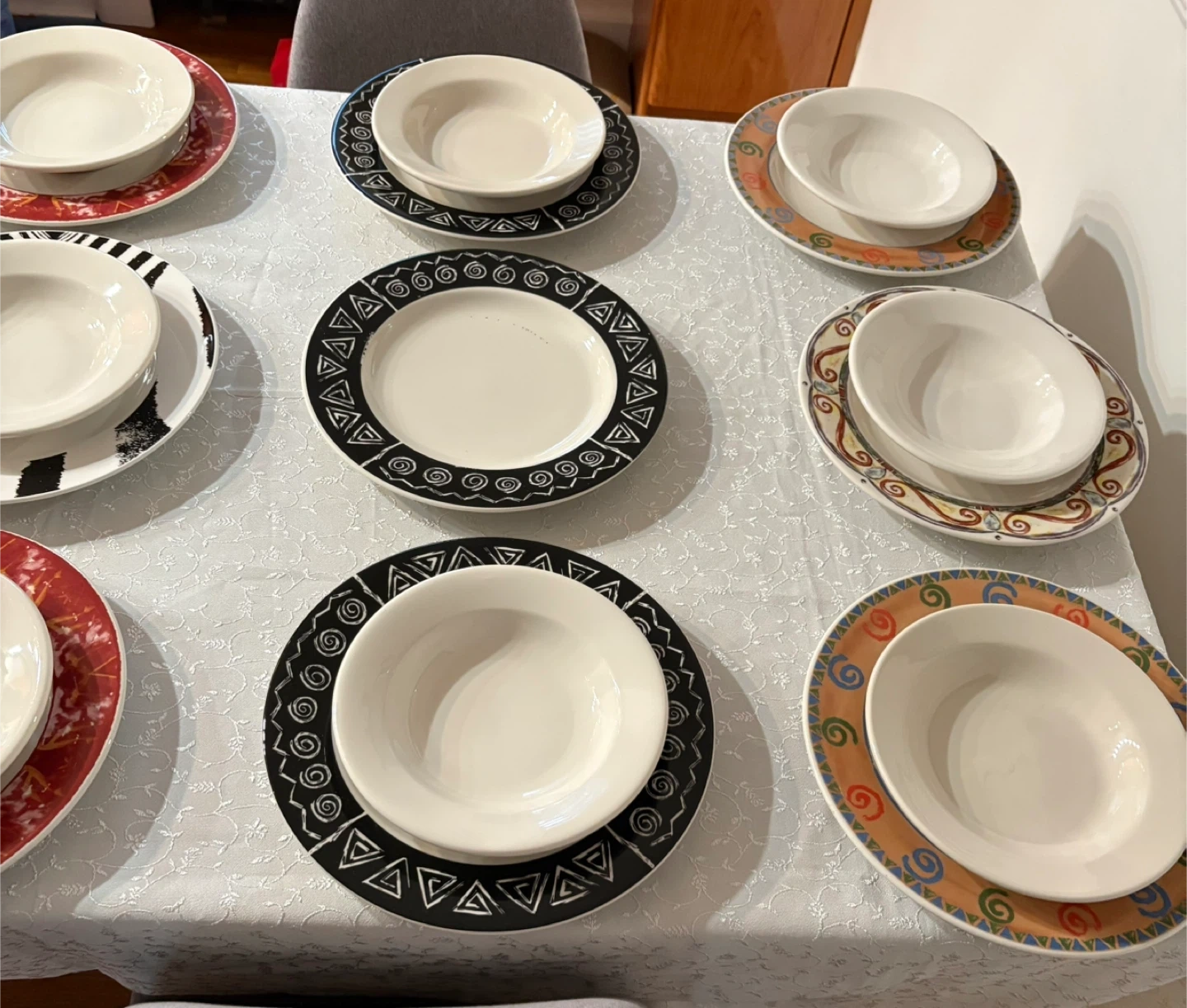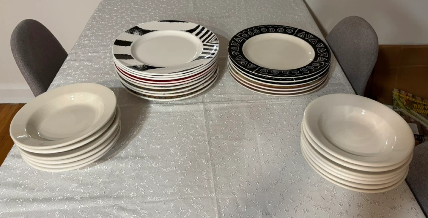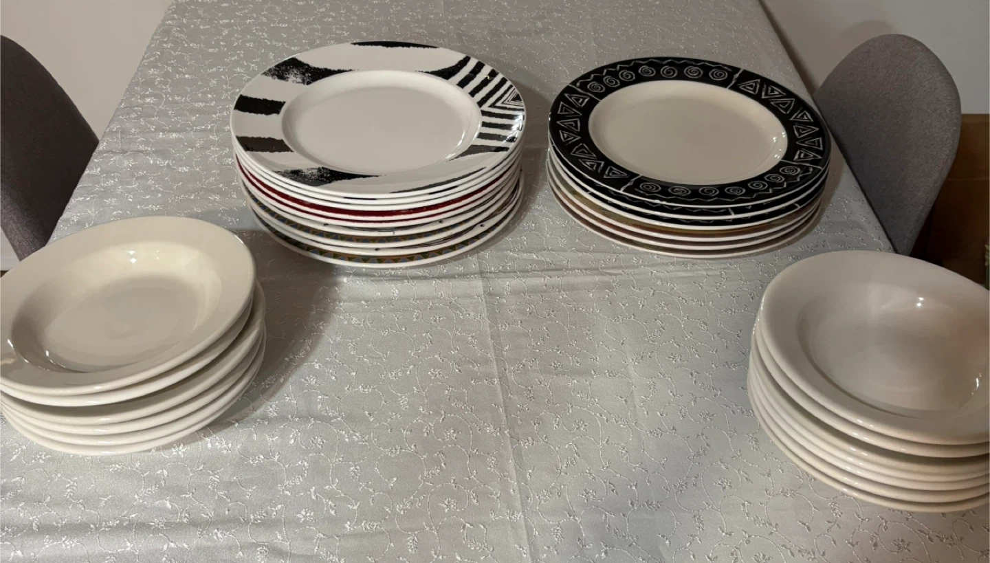 Selling a set of dinnerware, including plates and bowls. The set features a variety of patterns and colors. Perfect for adding a unique touch to your dining table!