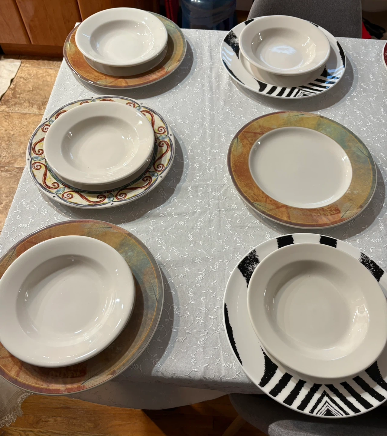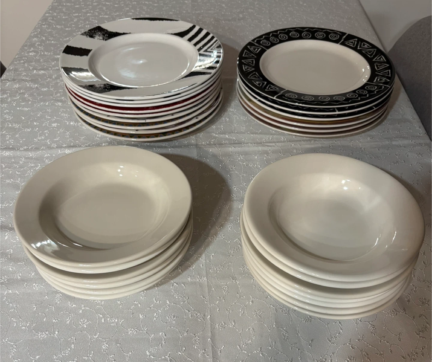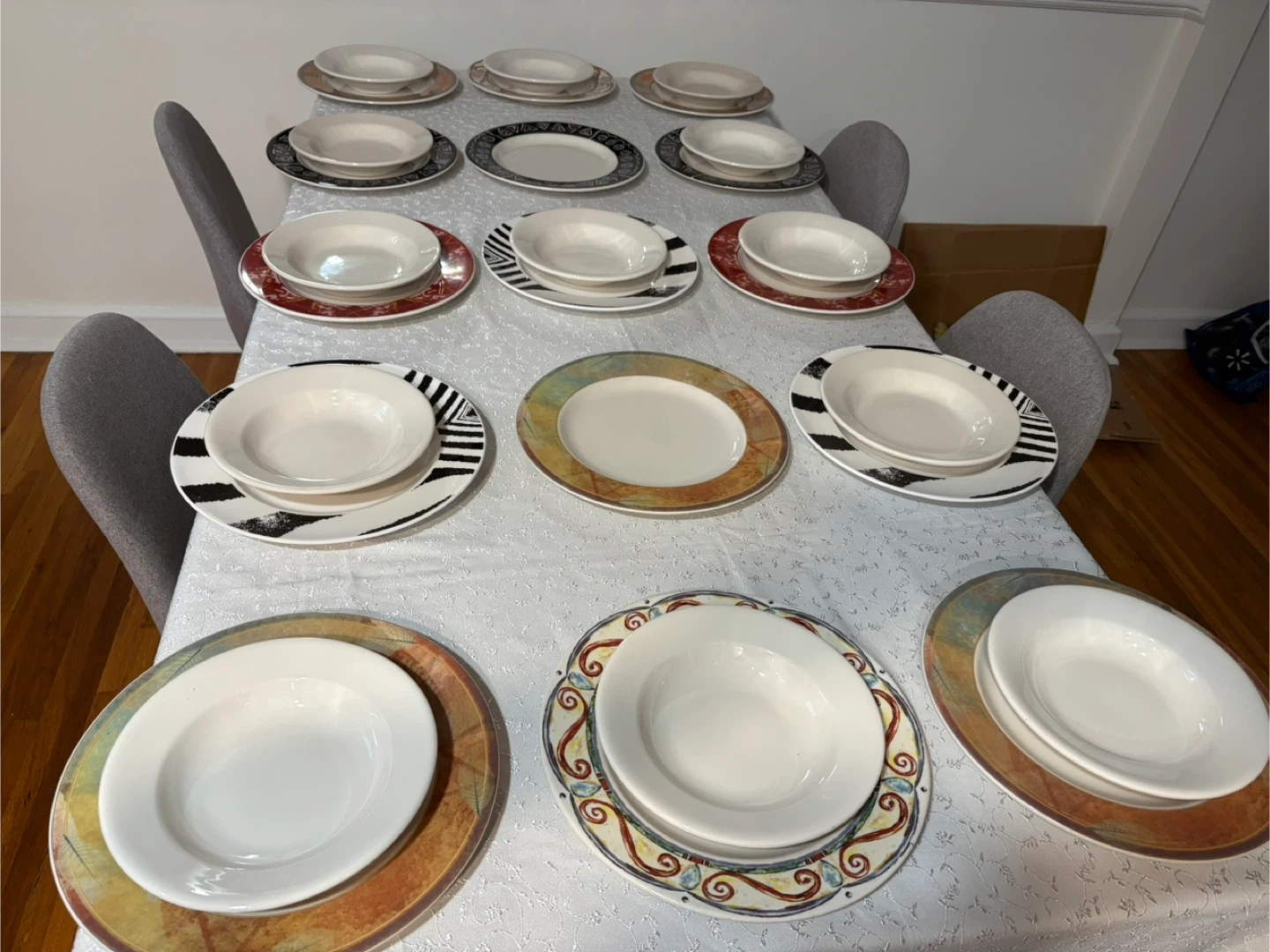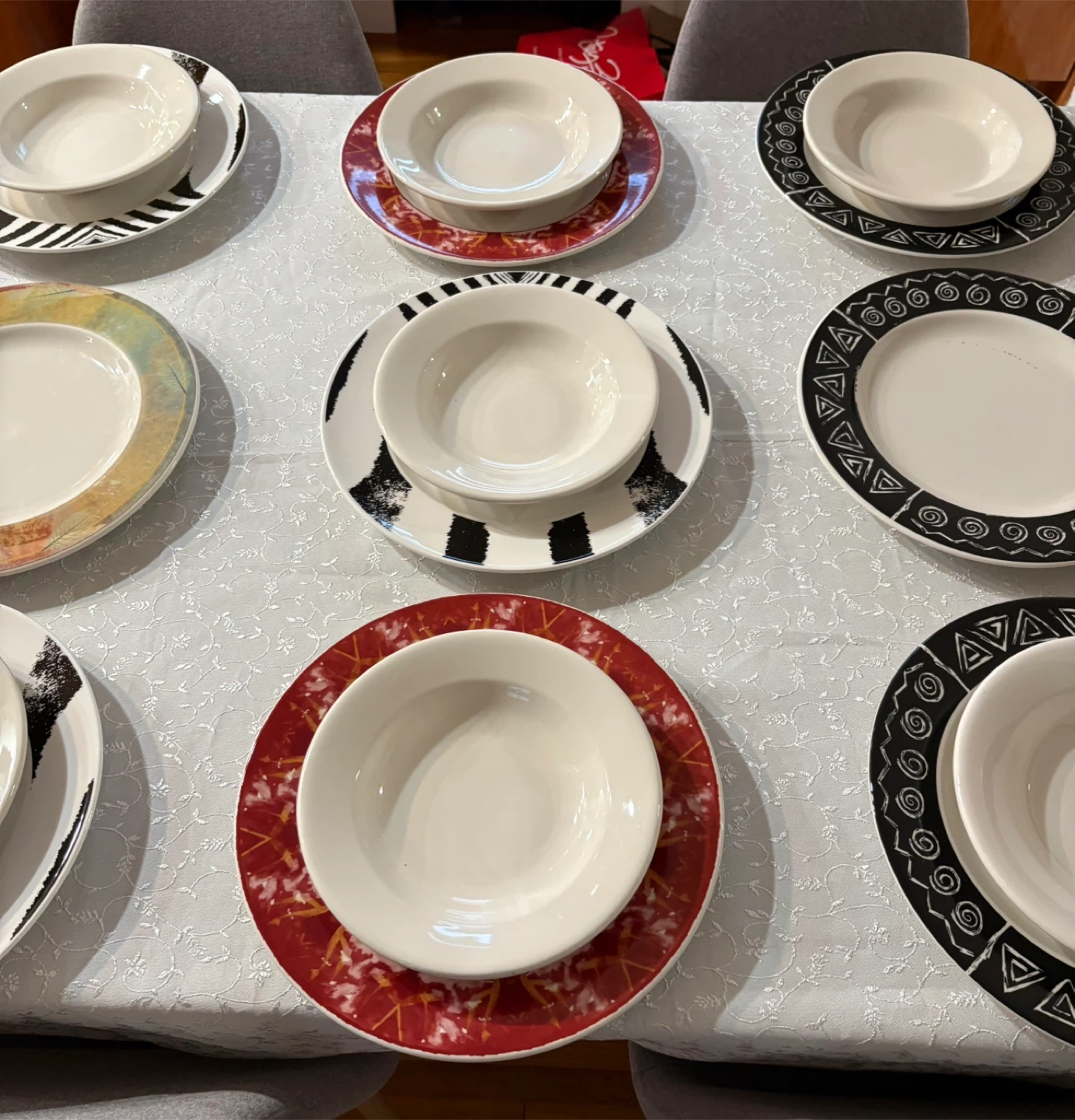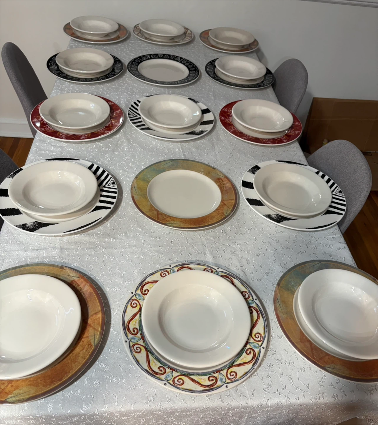 Selling a set of dinnerware, including plates and bowls. The set features a variety of patterns and colors. Perfect for adding a unique touch to your dining table!