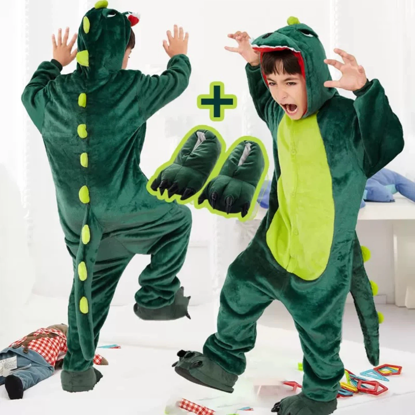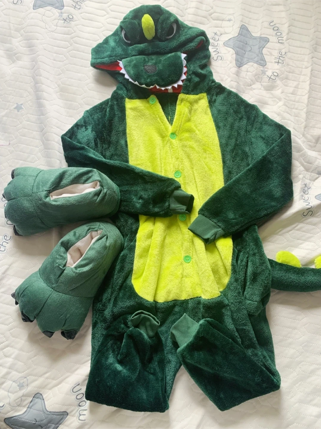 This is a fun and cozy dinosaur costume pajama set! It comes with matching slippers to complete the look. Perfect for dress-up, Halloween, or just lounging around the house