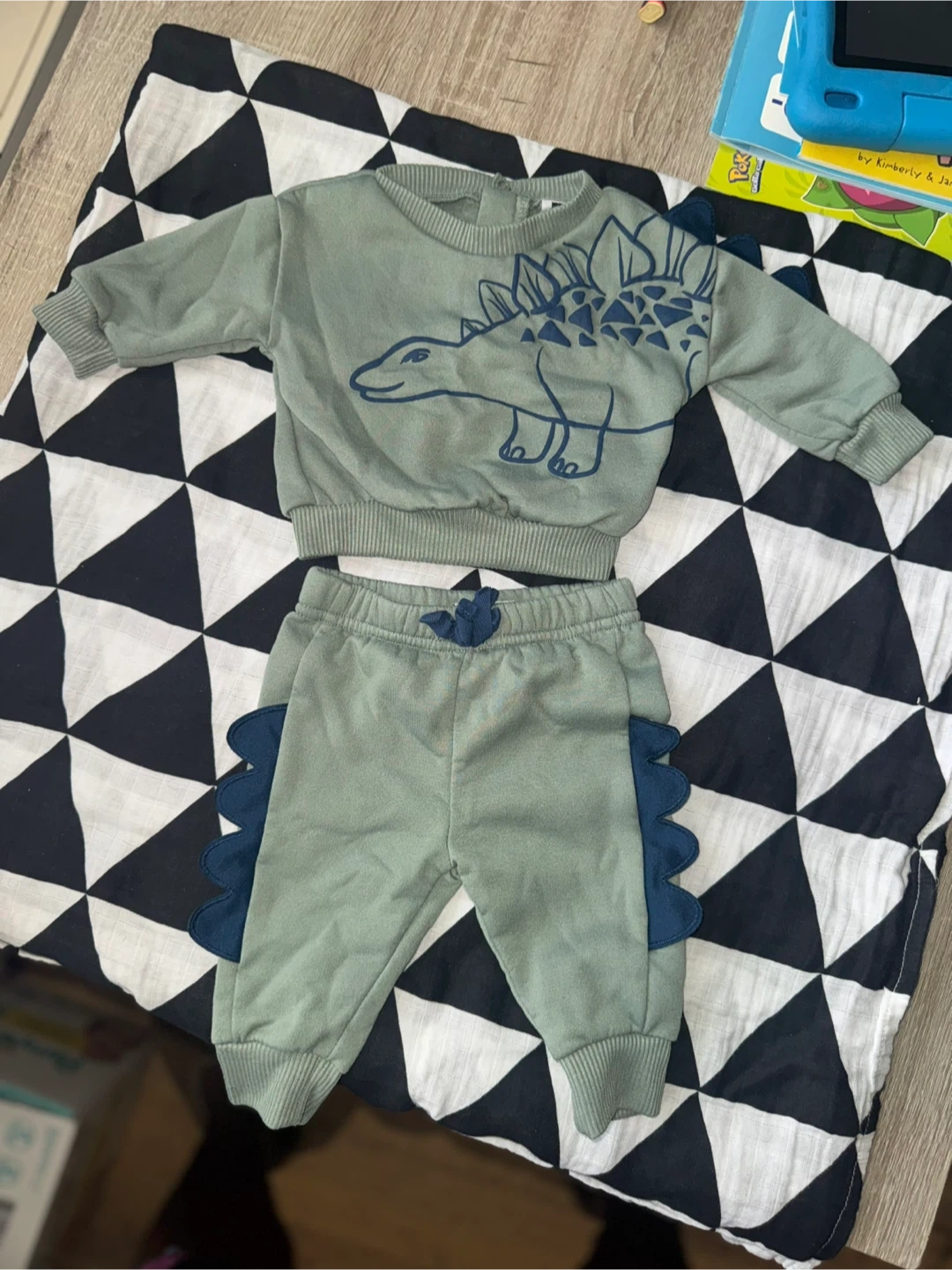Cute dinosaur outfit set! The top has a dinosaur design and the pants have dinosaur spikes on the sides. Perfect for your little one!