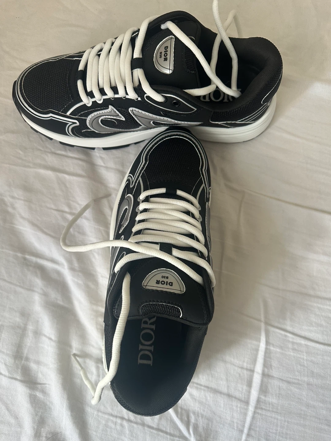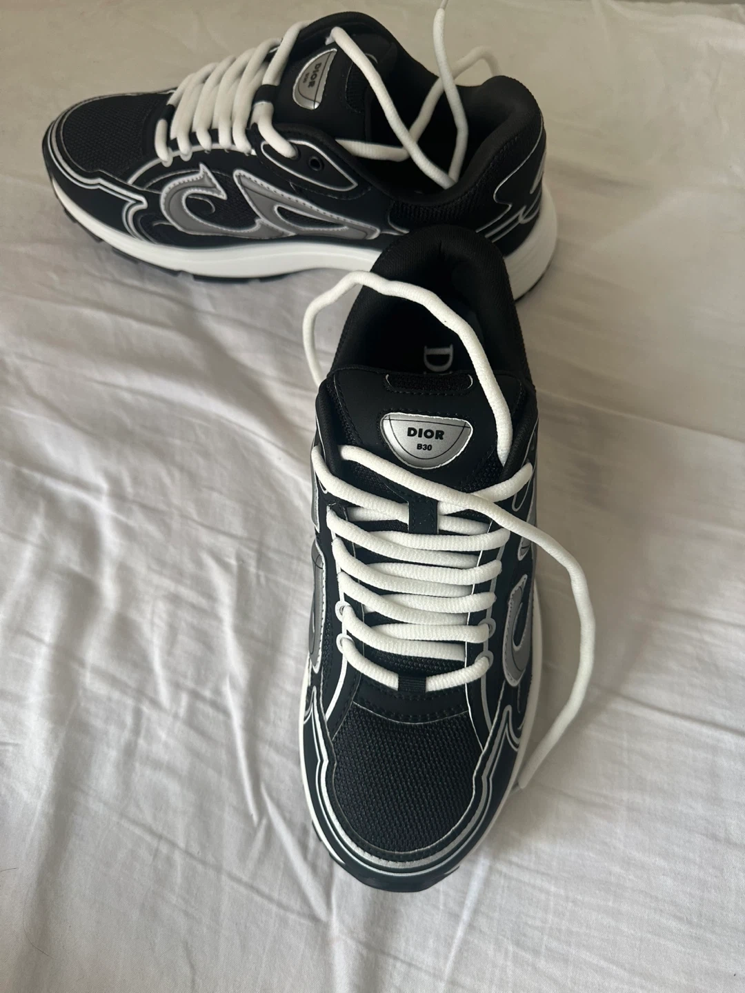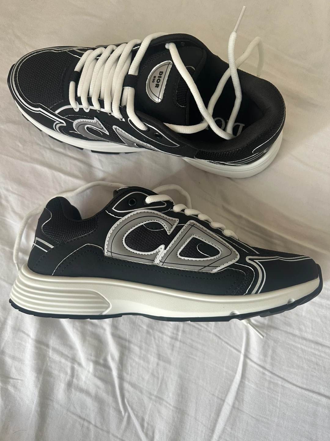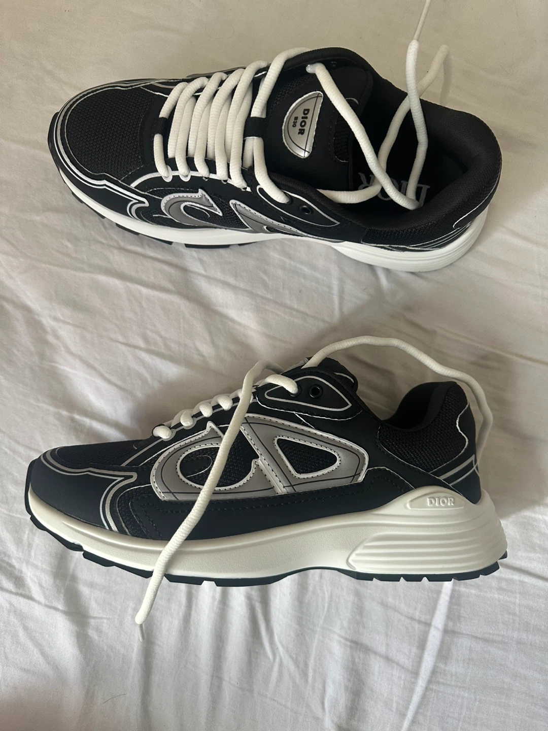 Selling a pair of Dior B30 sneakers in black and silver. New in Box