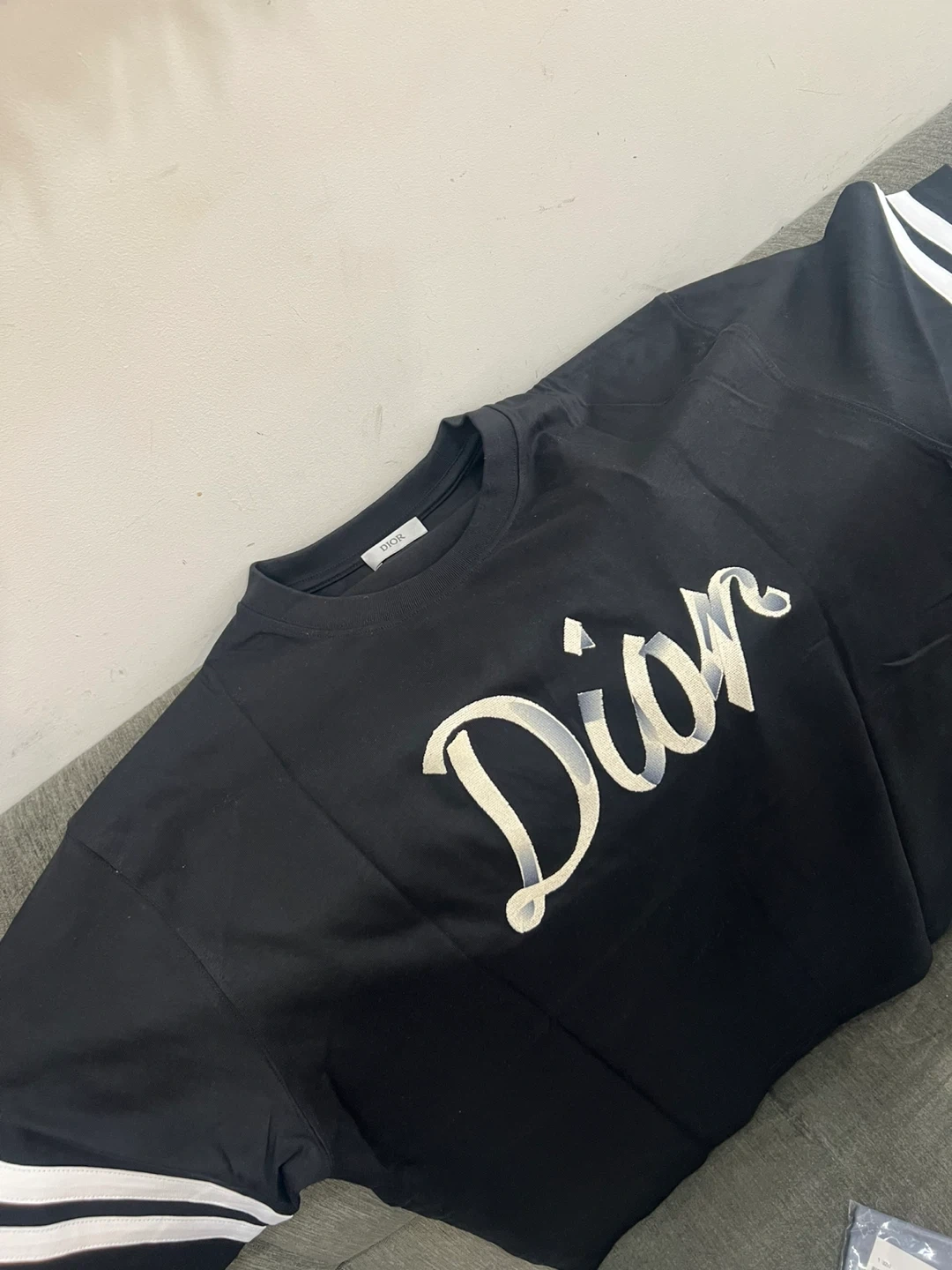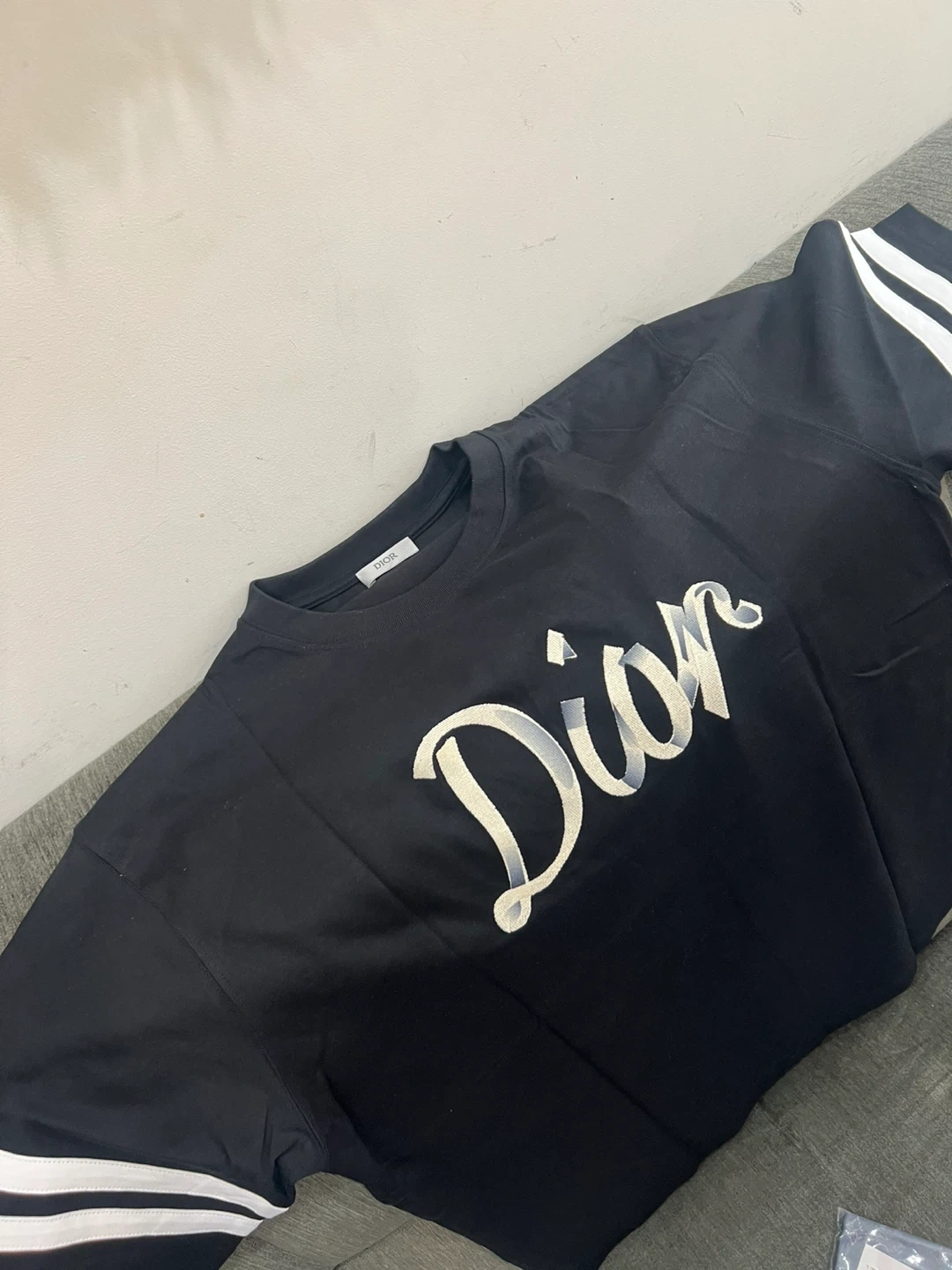99Selling a stylish black Dior t-shirt. It features the Dior logo in a cursive font on the front and the number 47 on the back. The sleeves have white stripes, adding a sporty touch. Perfect for casual wear!