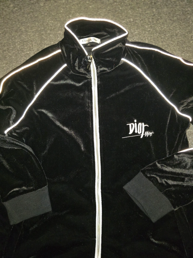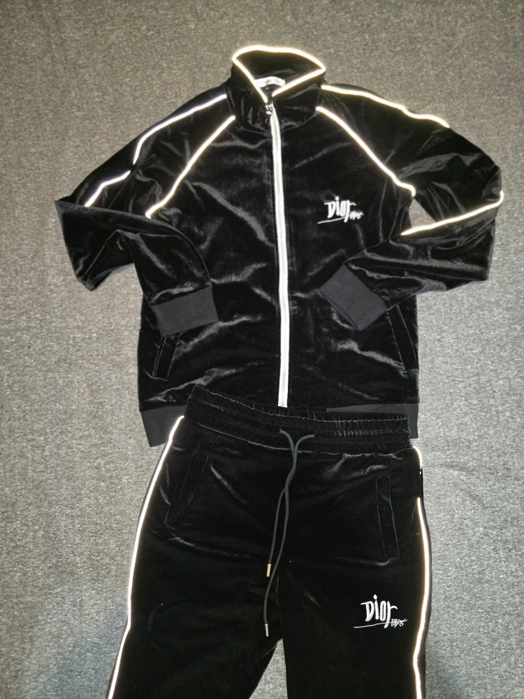 65Selling a Dior black velvet tracksuit. It features white piping along the jacket and pants. The Dior logo is embroidered on both pieces. Great for a stylish and comfortable look!