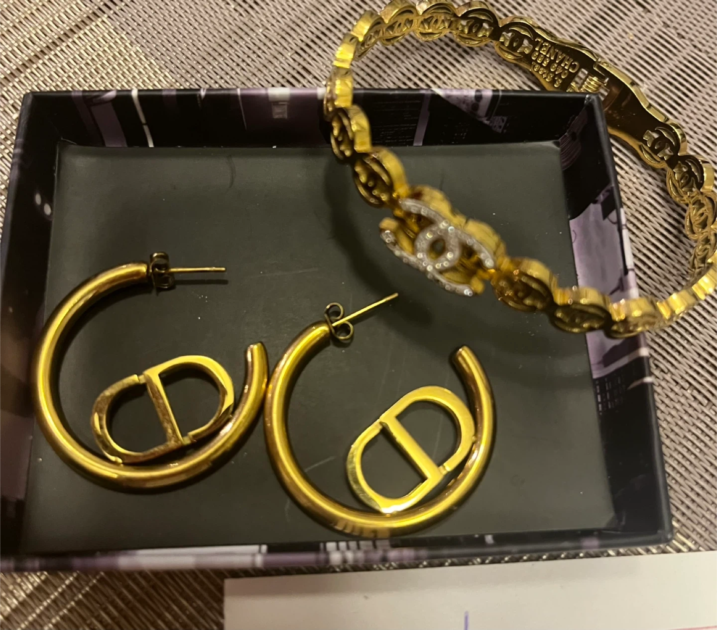 10CD logo Dior hoop earring Not stamped but good solid quality Chanel bracelet - very comfortable easy to open Good quality also Both never used just laid around for a while Both reps
