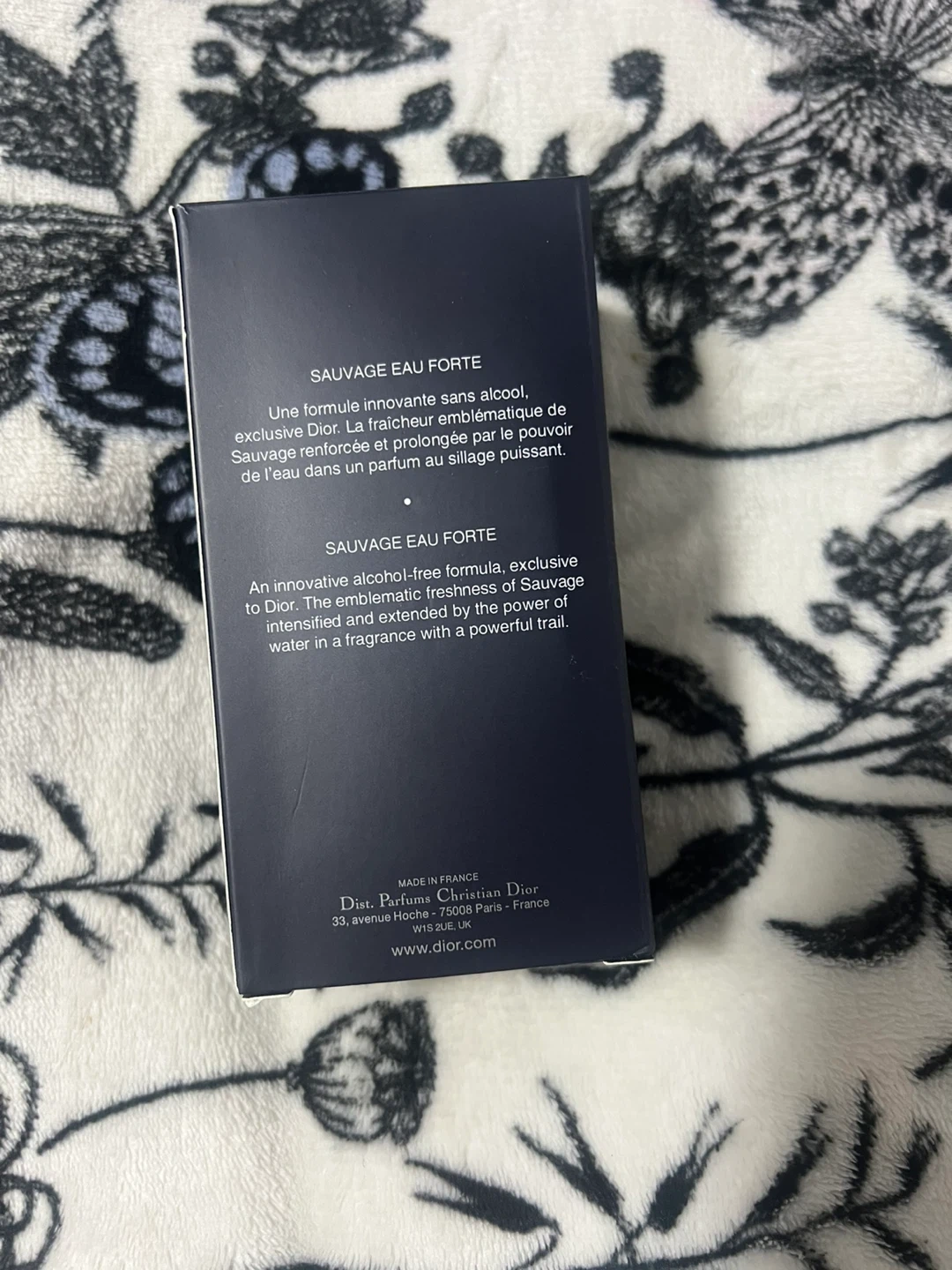 10Selling a Dior Sauvage Eau Forte perfume. It's a parfum sans alcool, alcohol-free formula, exclusive to Dior. The emblematic freshness of Sauvage is intensified and extended by the power of water in a fragrance with a powerful trail. It comes with the box