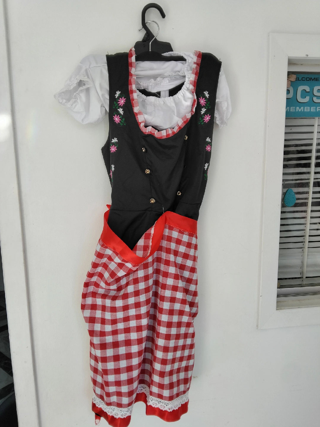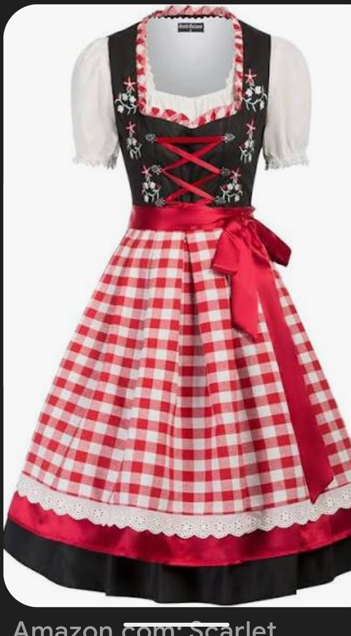 16Selling a Dirndl dress with a red and white gingham skirt. The top part is black with floral embroidery and red ribbon detailing. It's in good condition and ready for a new home! Fit like size medium