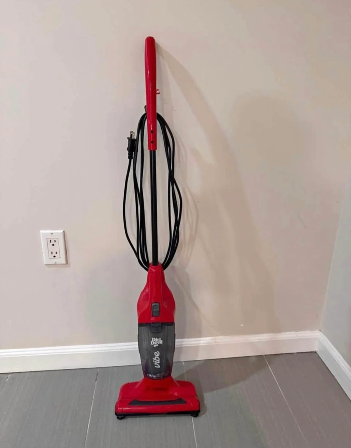 15Lightweight stick vacuum. Red and black. Long power cord. Great for small spaces.