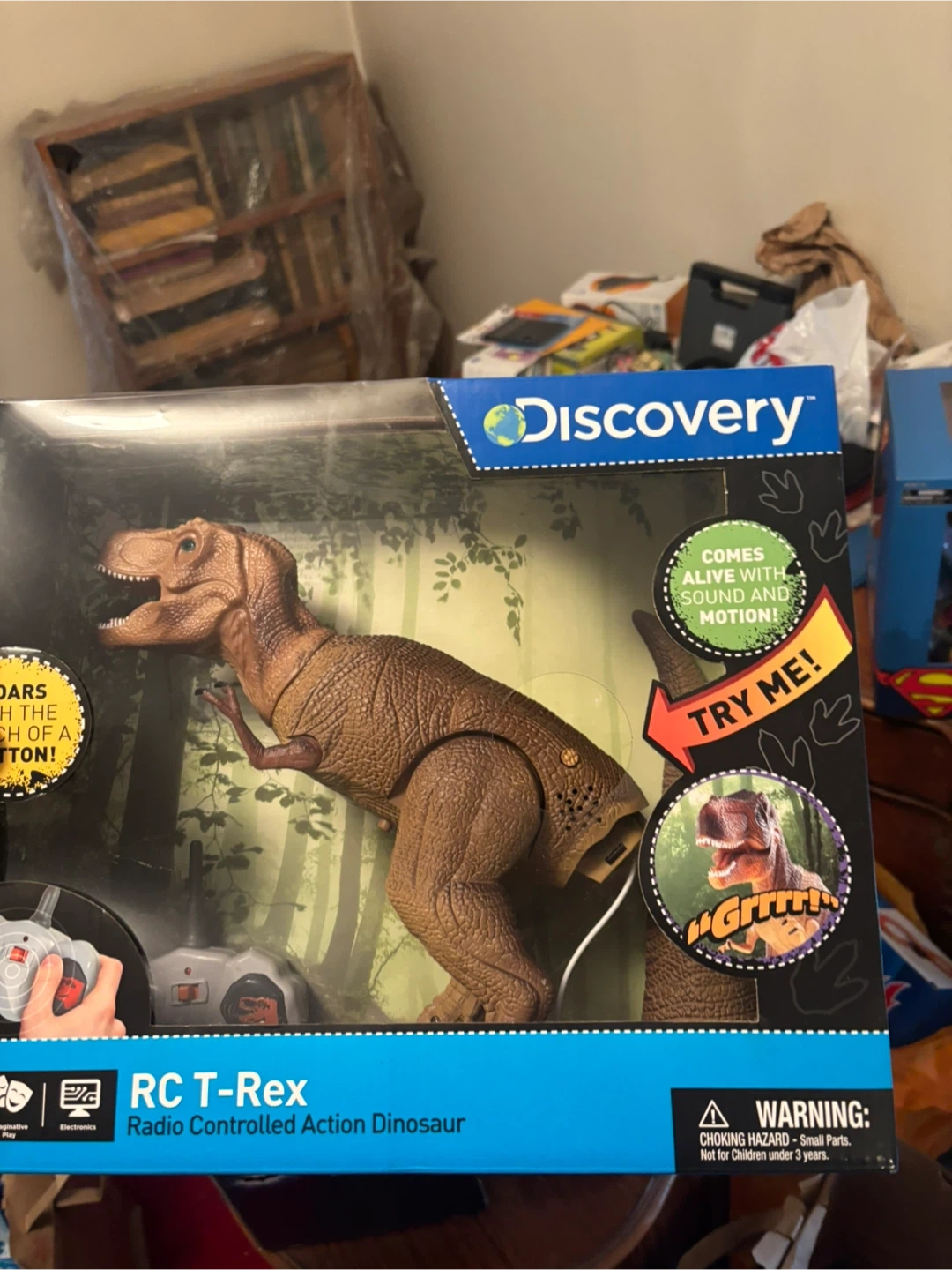 This is a Discovery RC T-Rex Radio Controlled Action Dinosaur. It roars with the touch of a button and comes alive with sound and motion. It also comes with a remote control and is suitable for ages 6+