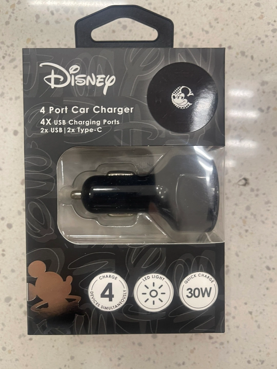 Selling a brand new Disney 4 Port Car Charger! It features 4 USB charging ports (2 USB and 2 Type-C). It can charge 4 devices simultaneously and has an LED light and quick 30W charge