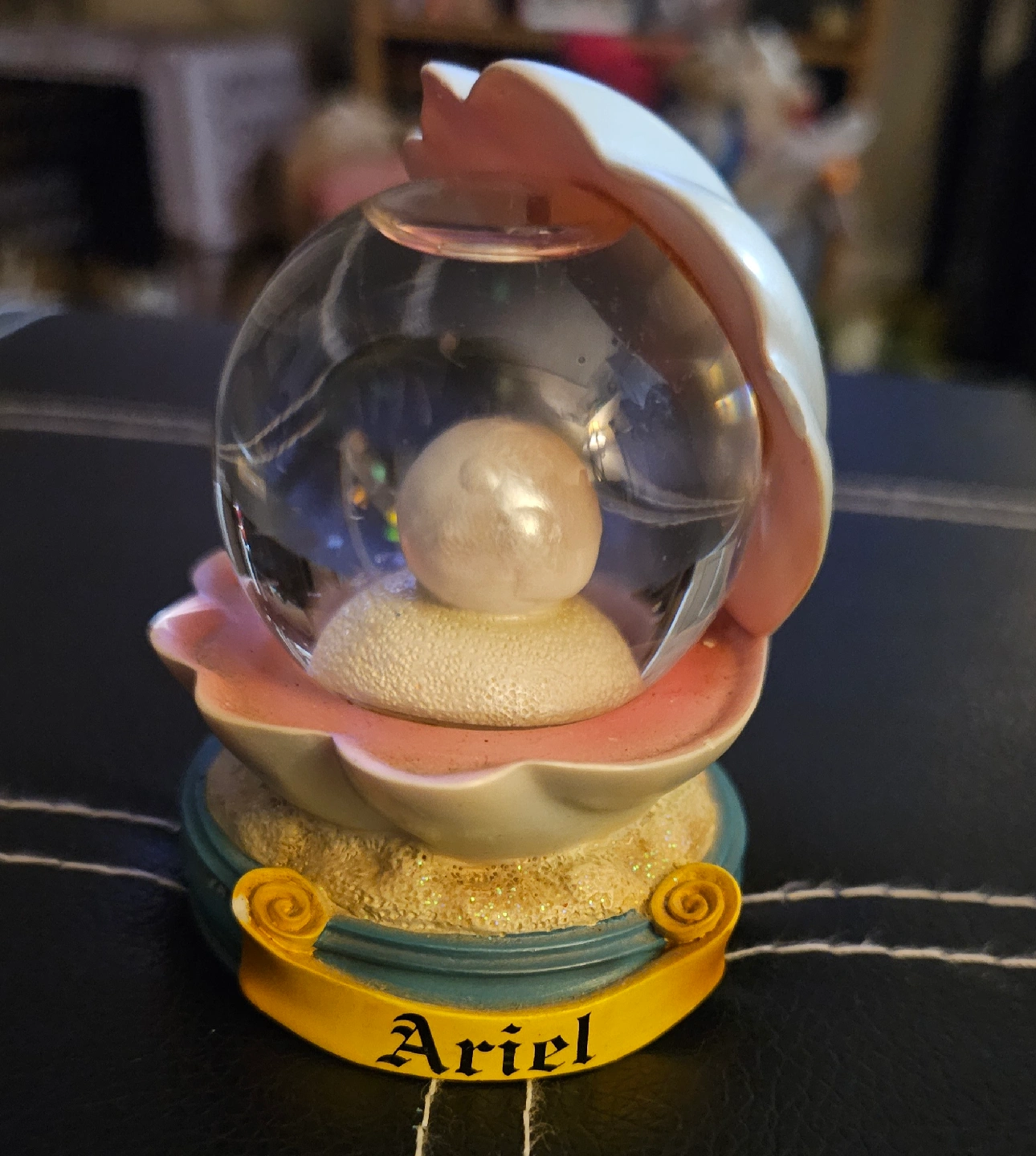 65Selling a cute Ariel snow globe! It features Ariel's name on a banner at the base and a pearl inside the globe. Perfect for any Disney collector or fan of The Little Mermaid