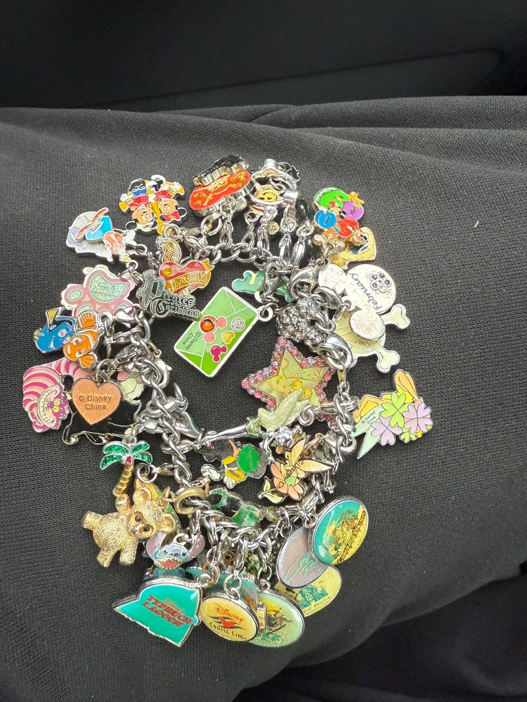 Selling a Disney charm bracelet with lots of fun charms! It features characters and icons from different Disney movies and parks, including Pirates of the Caribbean, Typhoon Lagoon, and Disney Cruise Line. A great accessory for any Disney fan
