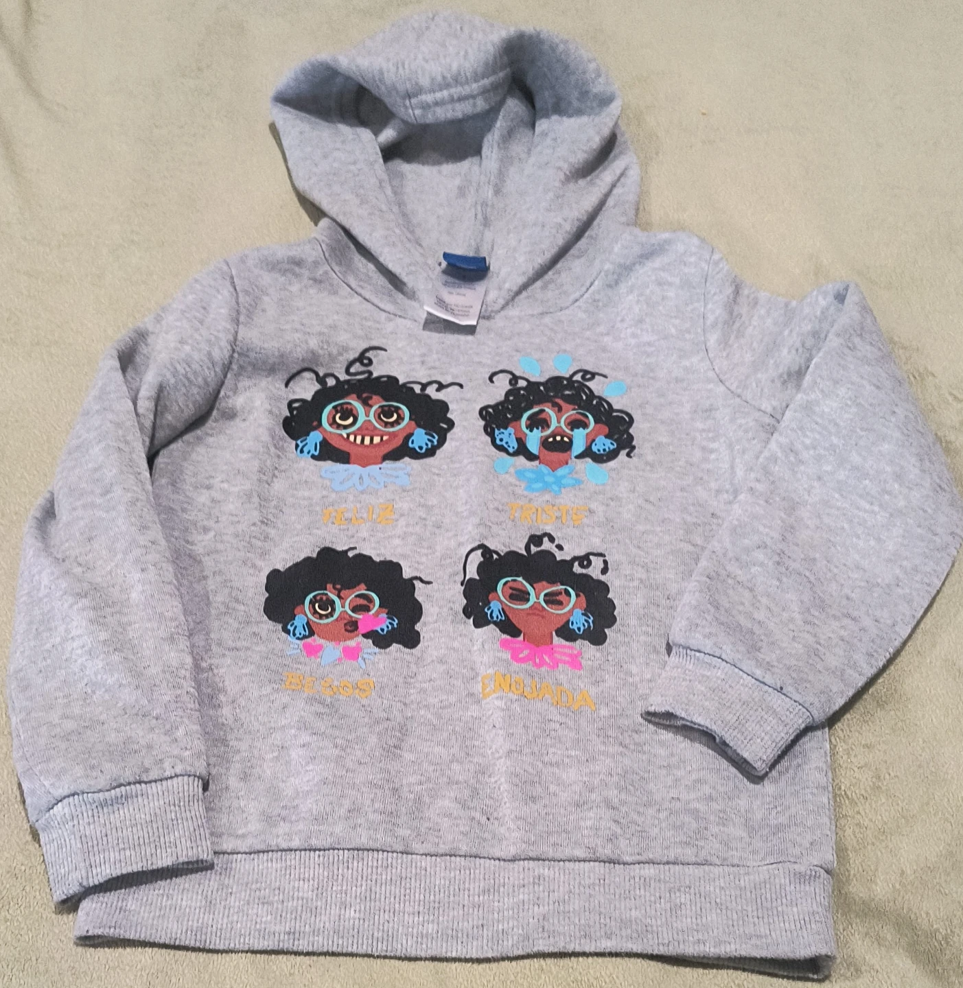 65This is a cute Disney Encanto hoodie for kids! It's a light gray color and features fun graphics from the movie. The size is 5/6, perfect for your little one