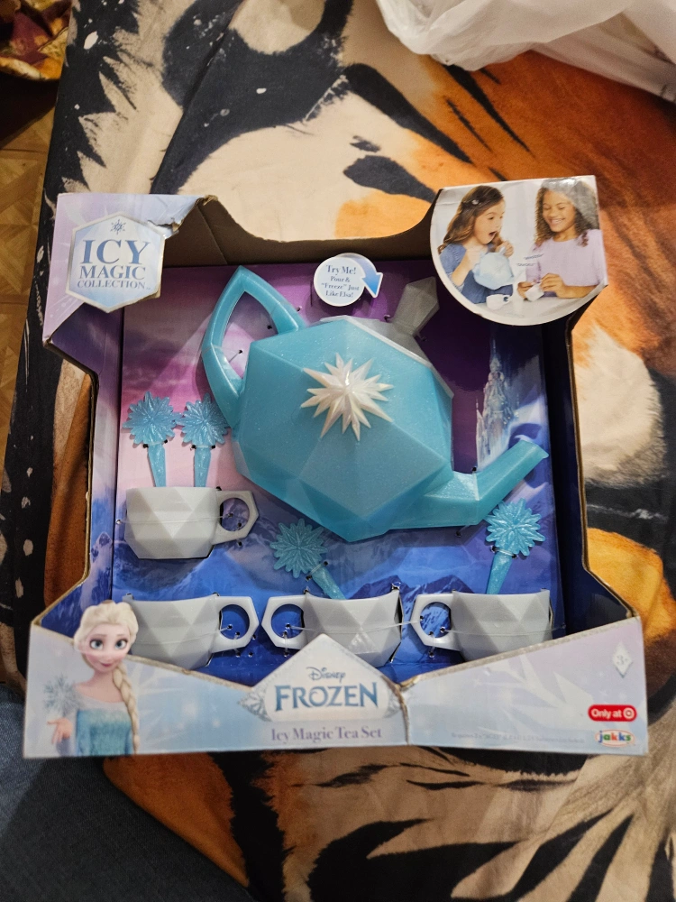 87I'm selling a brand new, in-box Disney Frozen Icy Magic Tea Set! It's perfect for hosting an icy tea party inspired by Elsa. The set includes 1 teapot and 4 teacups, plus 4 spoons. It also features sounds! PICK UP ONLY
