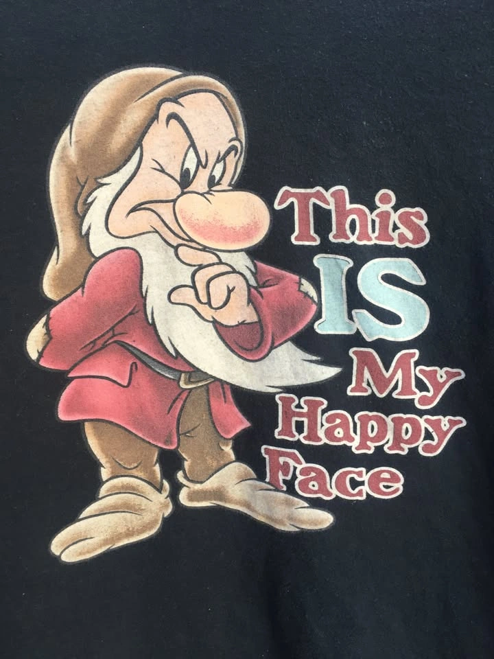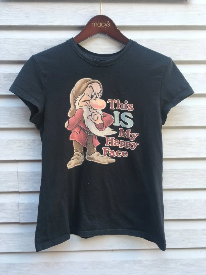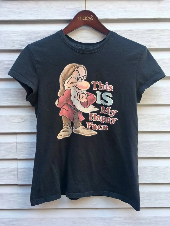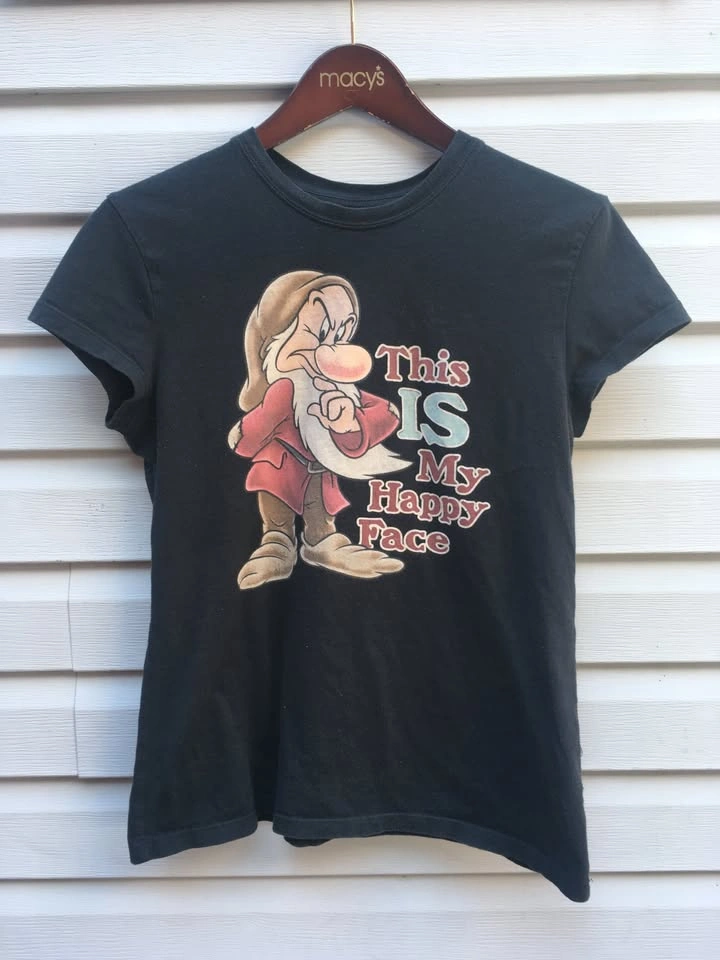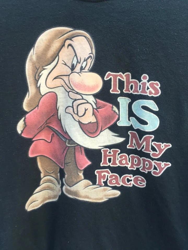 Disney Grumpy This Is My Happy Face T-Shirt - Size Large Short sleeve Grumpy tee is in excellent condition with no holes or tears. When laid flat, shirt measures 24” from top to bottom and 16” across body. 100% cotton construction. From a smoke and pet free home. Check out in person before purchasing. Thanks for looking.