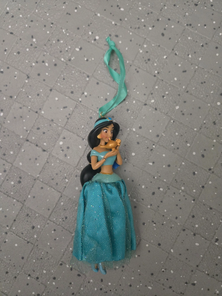 Here's a cute Jasmine ornament from Disney! It features Jasmine in her classic turquoise outfit, holding the magic lamp. Perfect for decorating a tree or adding a touch of Disney magic to any space
