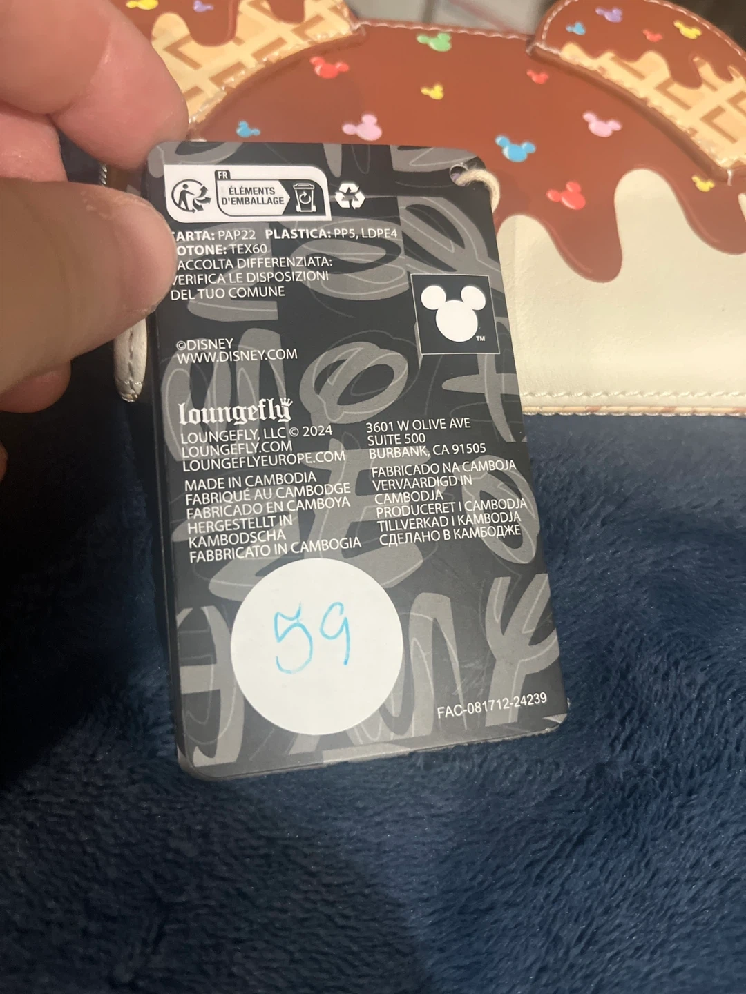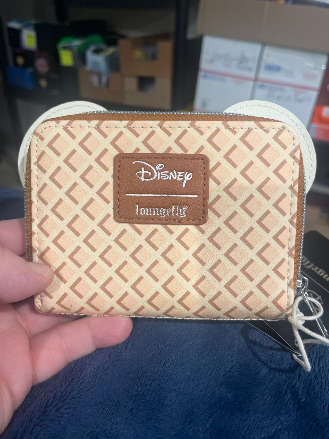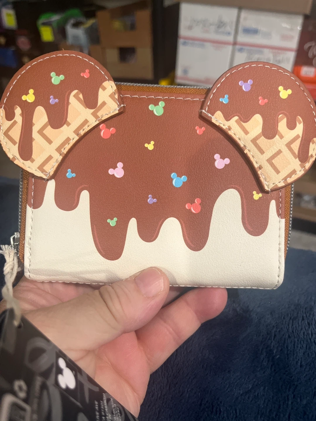 Super cute Disney Loungefly wallet featuring Mickey Mouse! It has a fun waffle and ice cream design with Mickey ears. Perfect for any Disney fan!