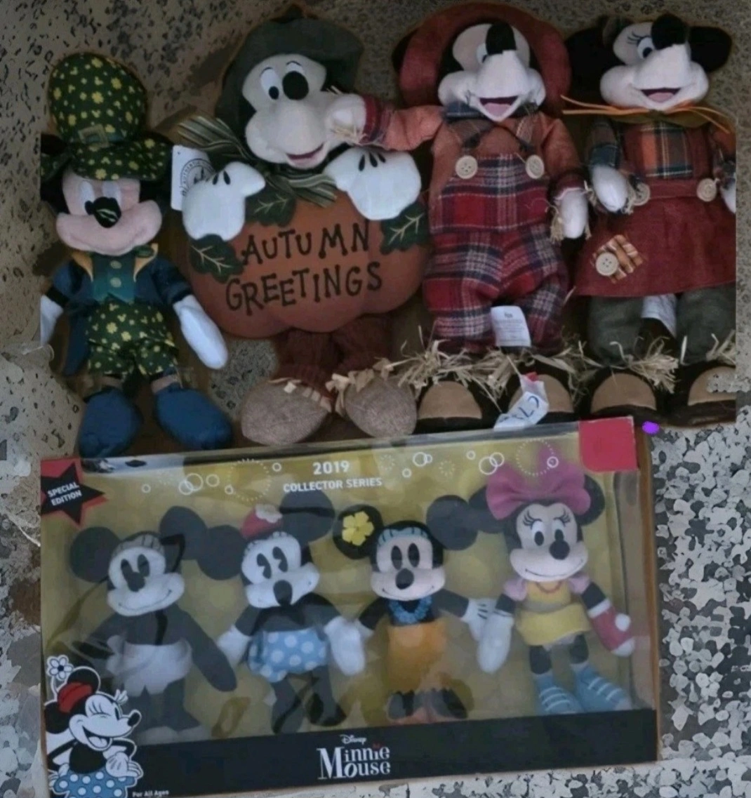 Selling a collection of Disney Mickey and Minnie Mouse plush dolls! Includes a special edition 2019 collector series set and several other fall-themed Mickey dolls
