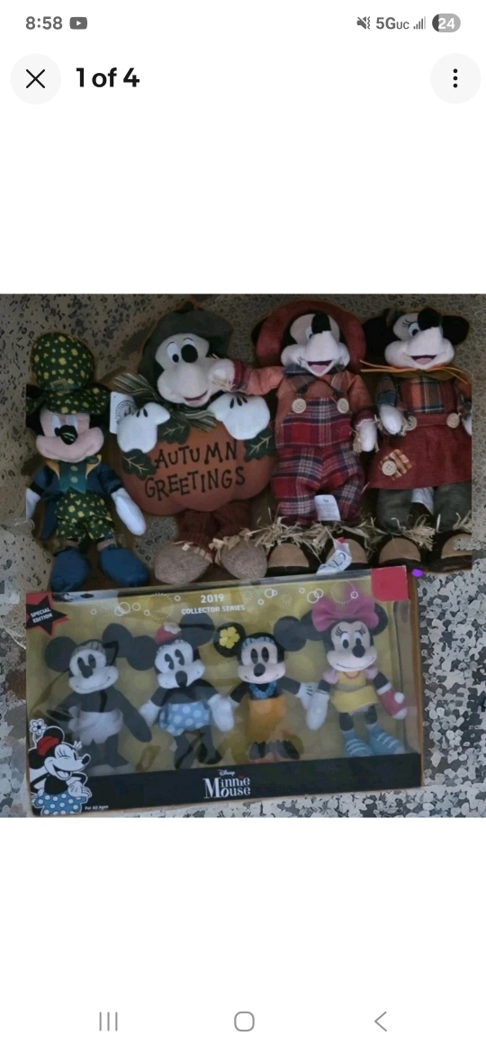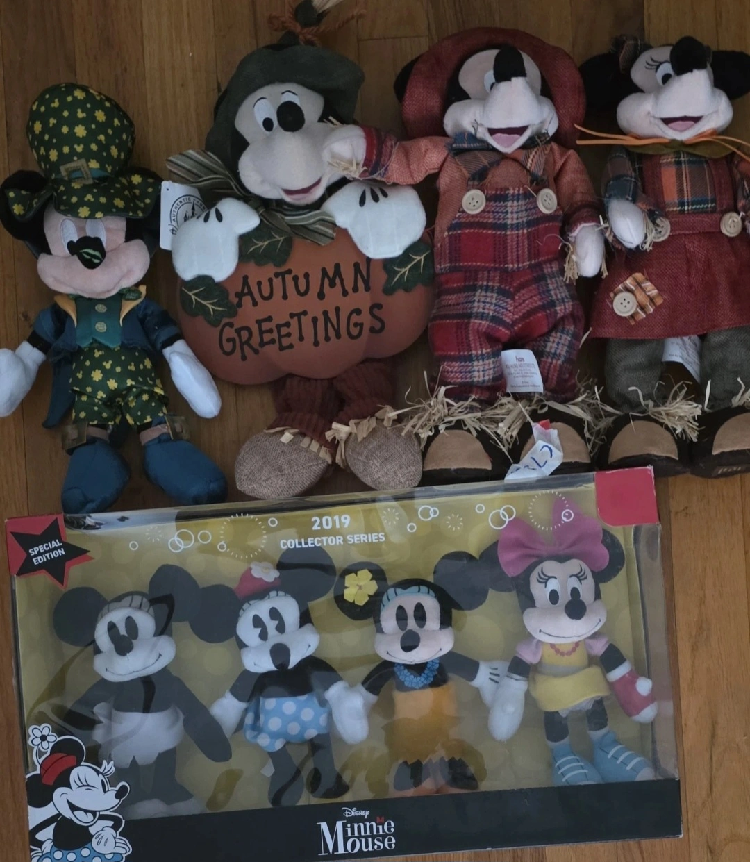 Selling a collection of Disney Mickey and Minnie Mouse plush dolls! Includes a special edition 2019 collector series set and several other fall-themed Mickey dolls