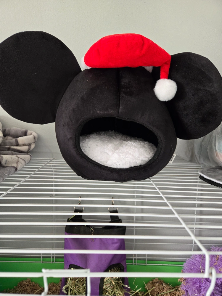 I'm selling a super cute Mickey Mouse pet bed! It's black with a white sherpa lining and even has a little Santa hat on top. Your furry friend will love snuggling up in this cozy bed!Perfect for smaller animals, guinea pigs,ferrets,bunnies,hamsters or even a kitten.Brand new never used!
