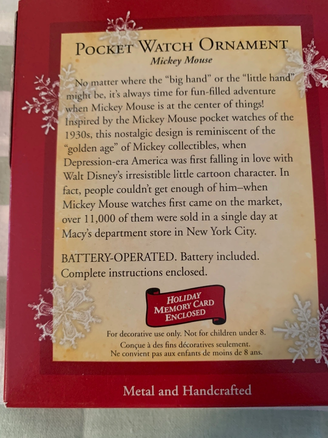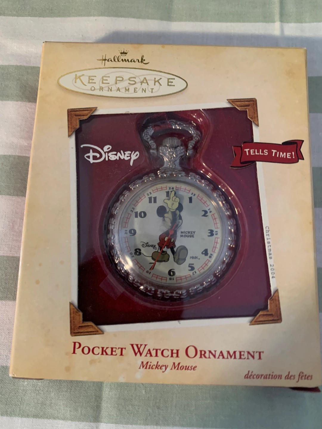 This is a Disney Mickey Mouse Pocket Watch Ornament. It is battery-operated and includes a battery and complete instructions enclosed. This nostalgic design is reminiscent of the "golden age" of Mickey collectibles, inspired by the Mickey Mouse pocket watches of the 1930s. It's metal and handcrafted, and comes in its original box.