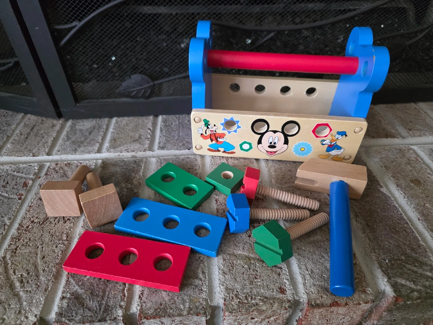 10Selling a cute Disney Mickey Mouse wooden tool box set! It includes a wooden tool box with Mickey Mouse, Donald Duck, and Goofy designs, along with colorful wooden tools and blocks. Perfect for little builders! Only comes with pieces shown. Pick up in Naperville near naper blvd and 87th street or near downtown Naperville off of Chicago and Charles