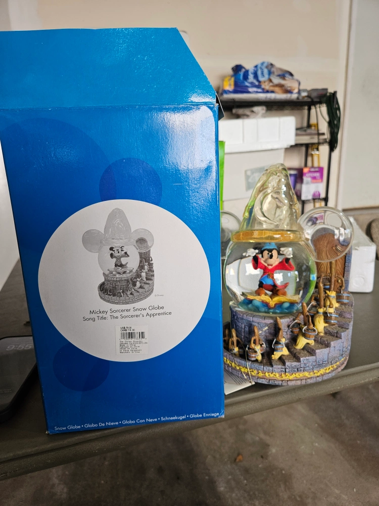 Here's a charming Disney Mickey Sorcerer's Apprentice snow globe! It's in great condition and comes with the original box. The snow globe features Mickey Mouse as the Sorcerer's Apprentice, complete with brooms and buckets. It also plays music! A perfect collectible for any Disney fan
