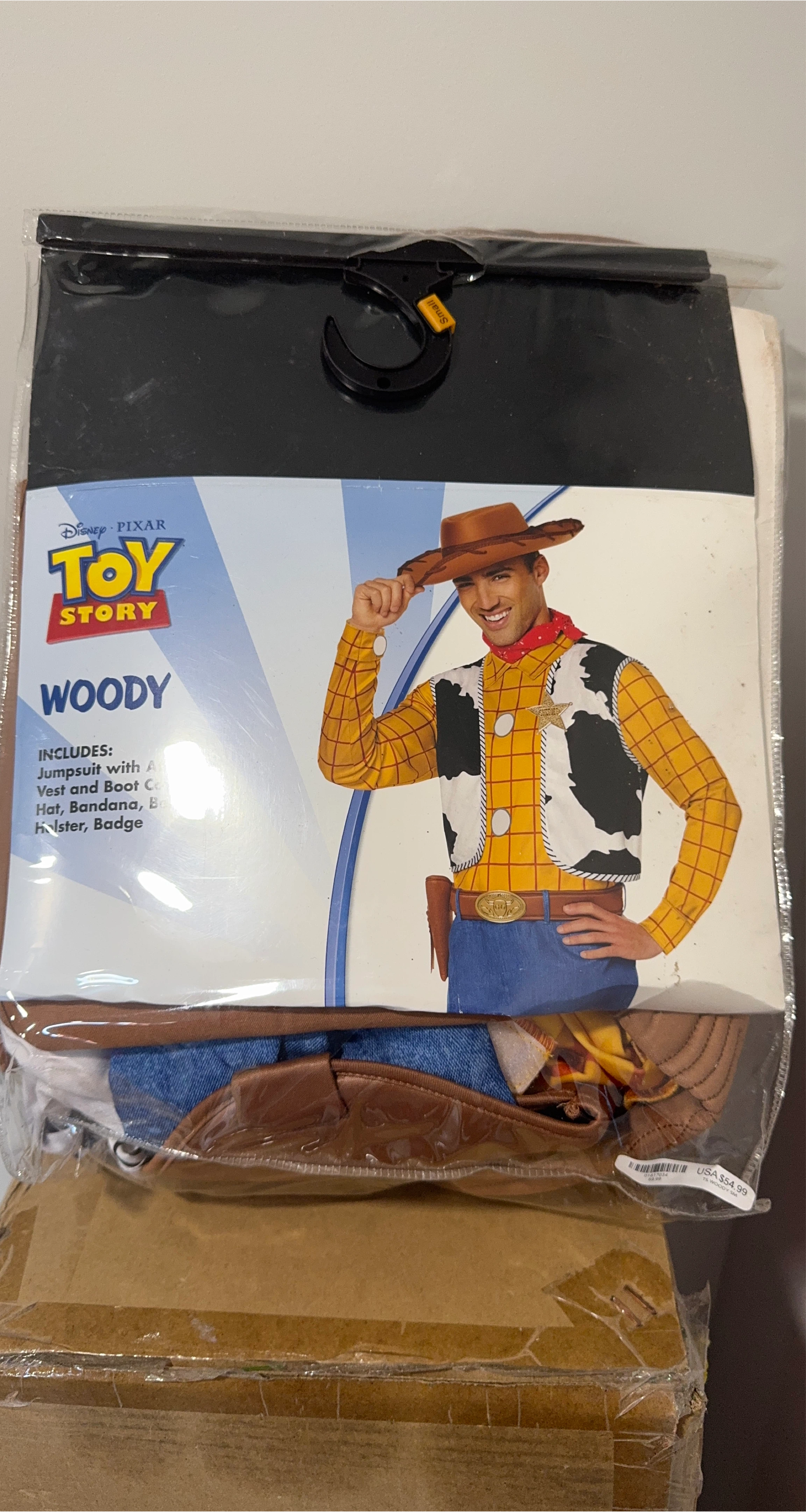 Selling a brand new, in-package Disney Pixar Toy Story Woody costume! This is a size small and includes the jumpsuit, vest with attached boot covers, hat, bandana, belt, holster, and badge. Originally priced at $54.99