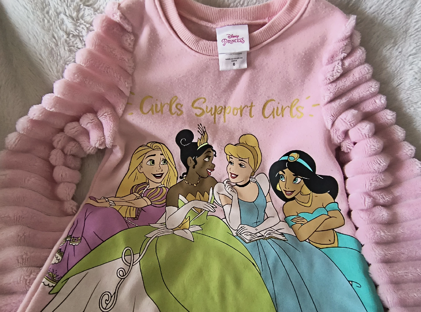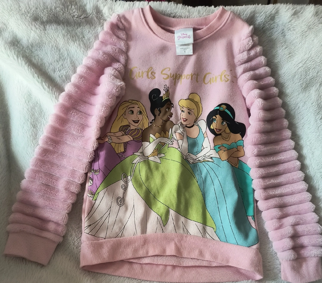65A super cute Disney Princess pullover featuring Rapunzel, Tiana, Cinderella, and Jasmine! The sleeves have a unique, textured design. Size 6