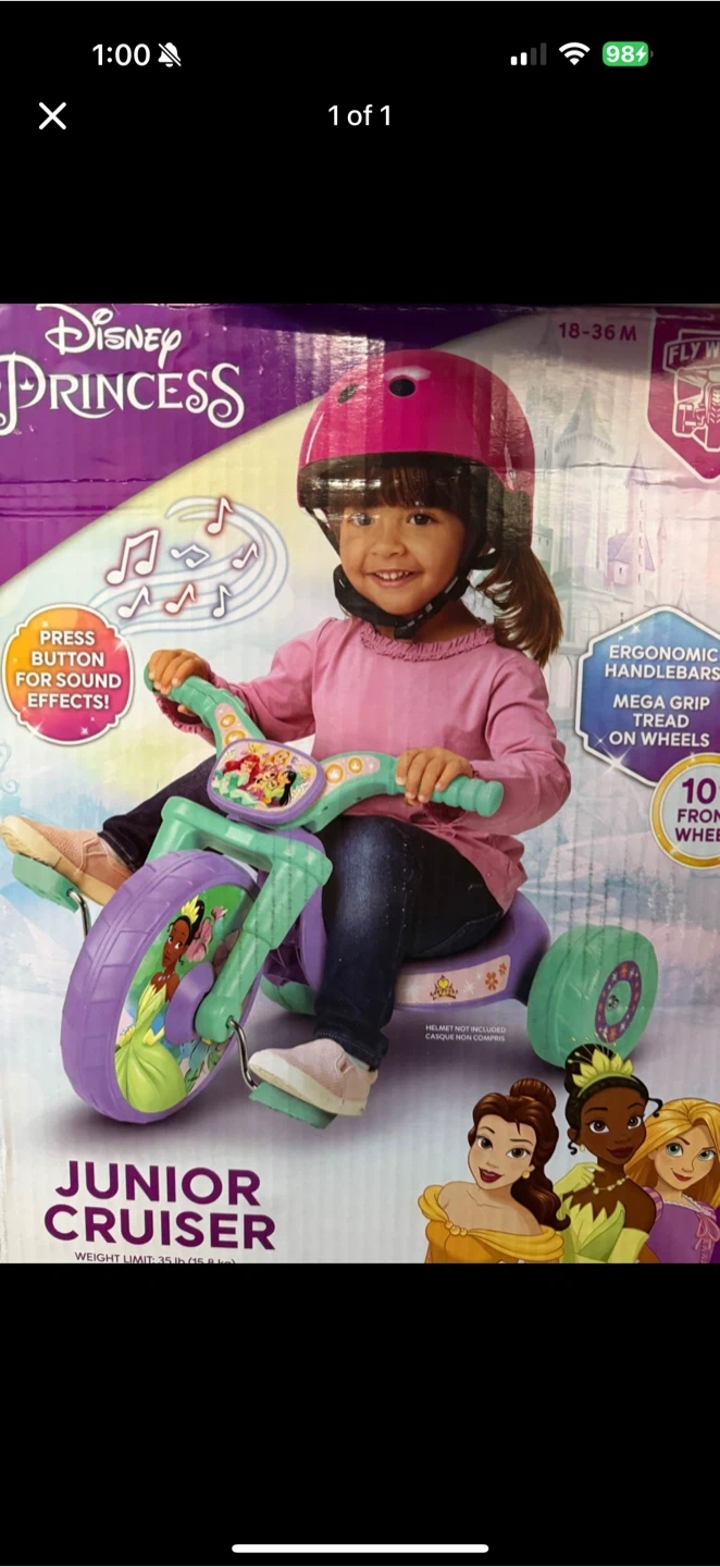 Selling a Disney Princess Junior Cruiser tricycle! It's designed for kids aged 18-36 months. It features ergonomic handlebars and mega grip tread on the wheels. There's also a button to press for sound effects!