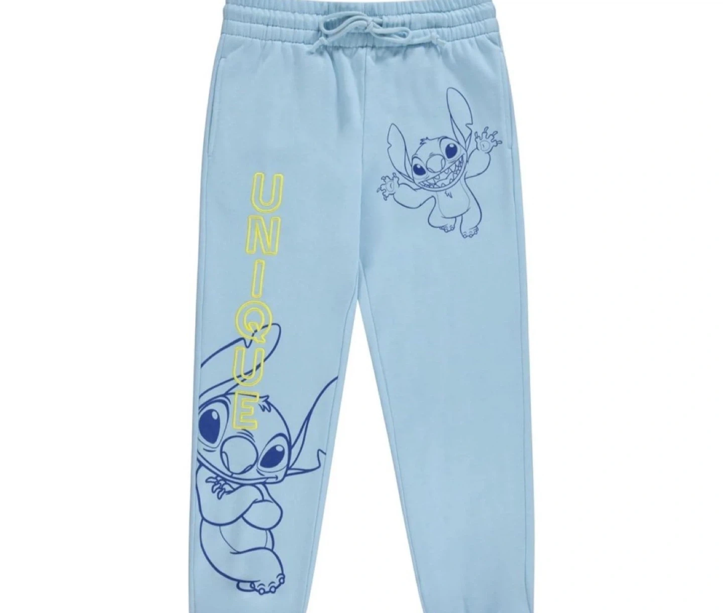 75Cute light blue sweatpants featuring Stitch! The pants have a drawstring waist and fun Stitch graphics on the legs Size medium