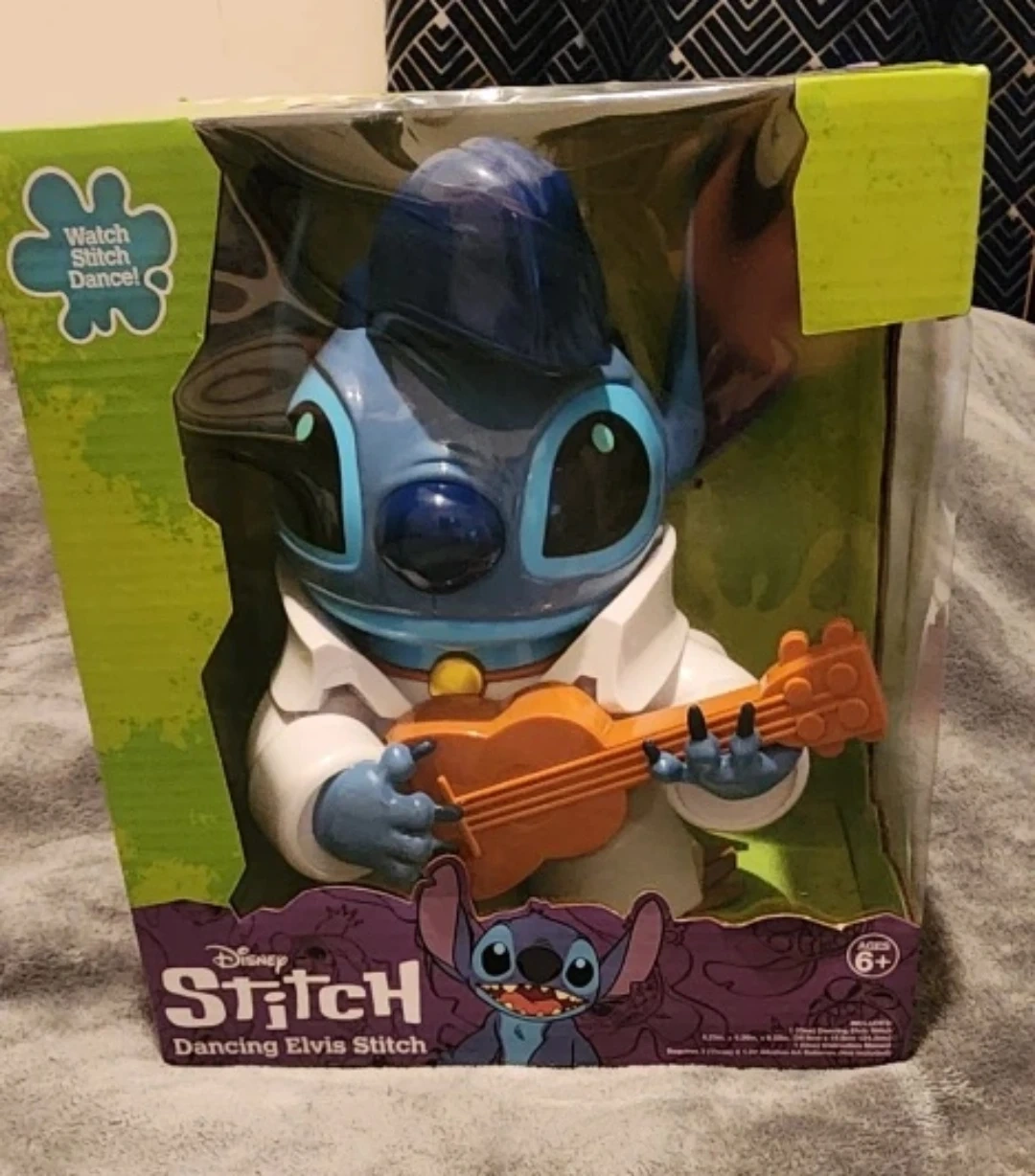 24Bring home your very own dancing Stitch Elvis figure! This Stitch Elvis figure stands approximately 9 inches tall and is battery operated. It's brand new in the box, never been opened! It also includes 1 figure and 1 manual of instructions. Requires 3 alkaline AA batteries of 1.5 V (not included).