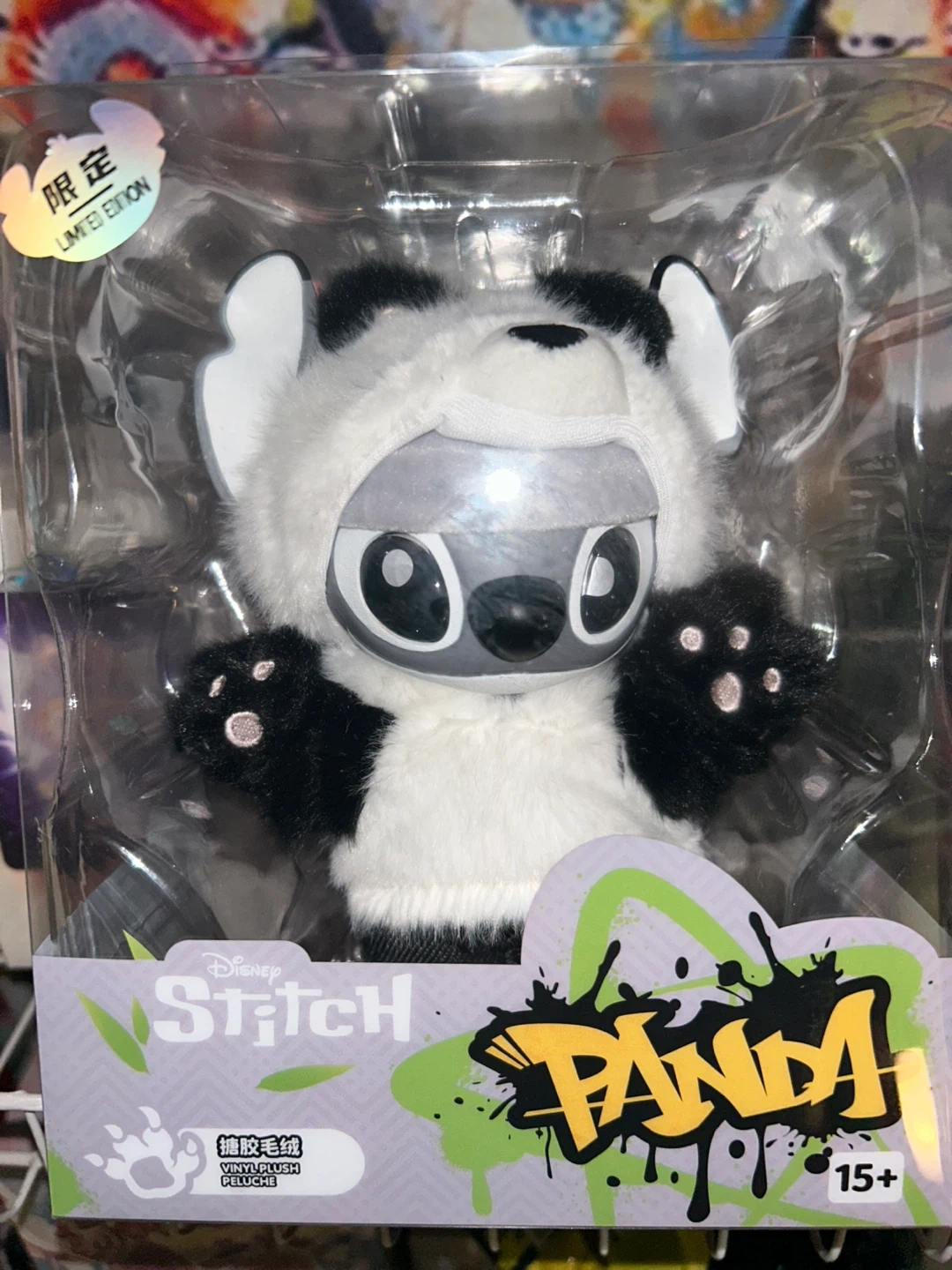 Selling a new Disney Stitch plush dressed as a panda! This is a limited edition item, still in its original packaging. It's a vinyl plush and recommended for ages 15+