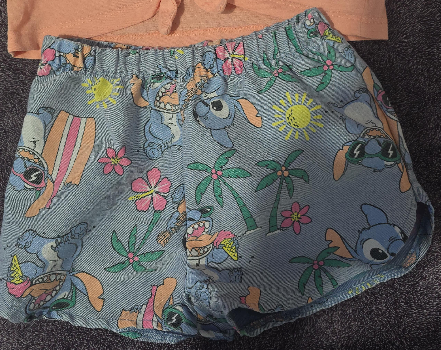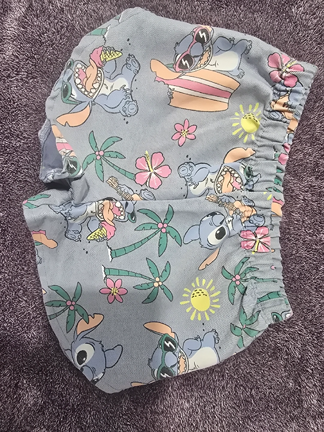 Cute Disney Stitch themed shorts! Features a fun print with Stitch, palm trees, flowers, and suns. Perfect for a casual summer day!