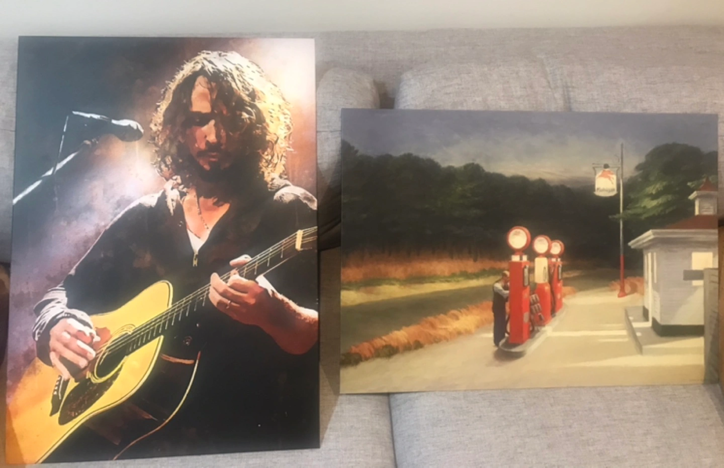 265Two metal prints from Displate. One features Chris Cornell playing an acoustic guitar. The other is “Gas,” by Edward Hopper (1940). Excellent condition. Ready to hang.