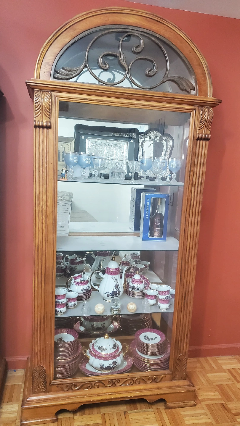 10Selling 2 display china cabinets with glass shelves. It's in good condition and perfect for displaying collectibles or fine china. The cabinet has a wooden frame and a decorative arched top with metal detailing. It offers ample storage and display space. Genuine wood, includes light. $215 for 1 or $400 for both