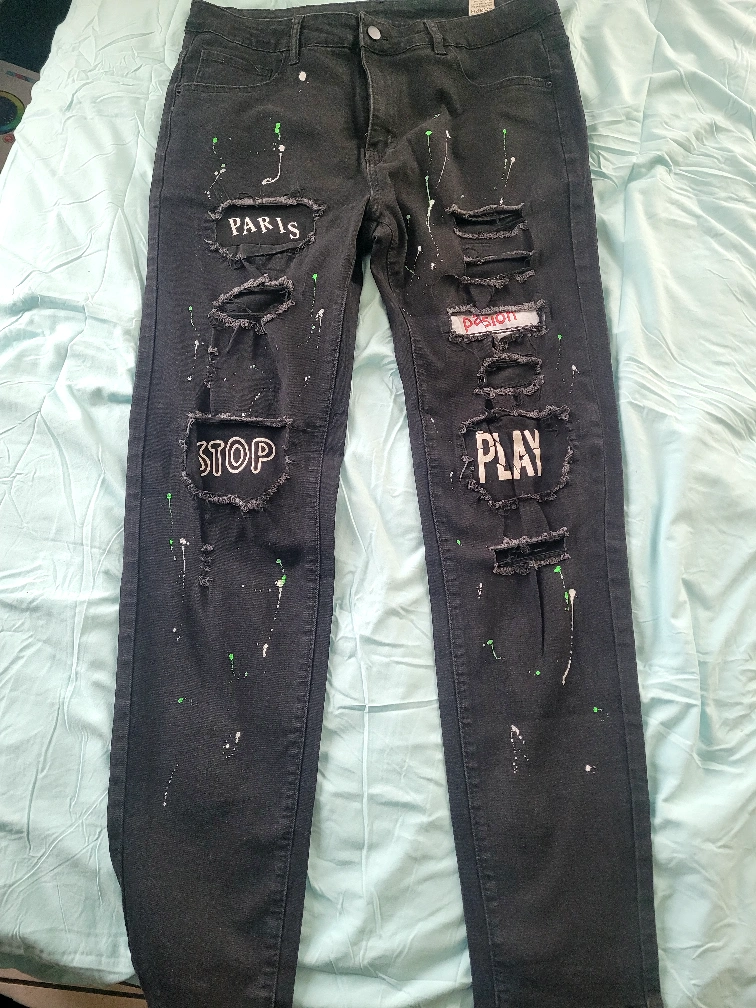 Selling a pair of distressed black denim jeans. They feature ripped details and unique designs with words like 'Paris', 'Stop', and 'Play'. They're in good condition and ready for a new home!