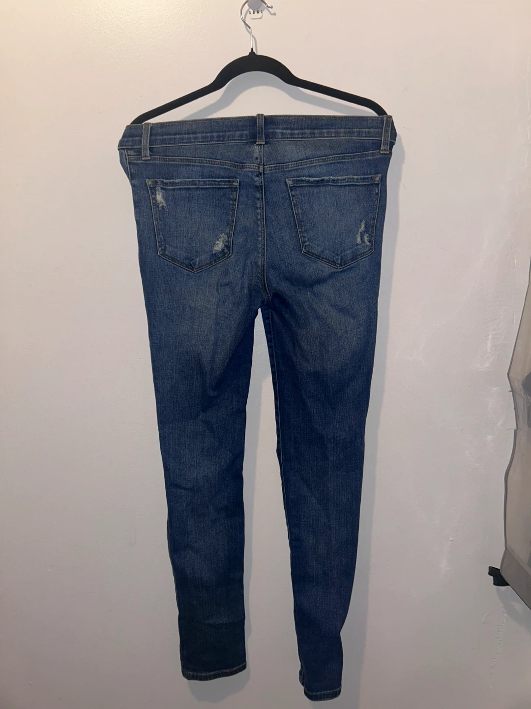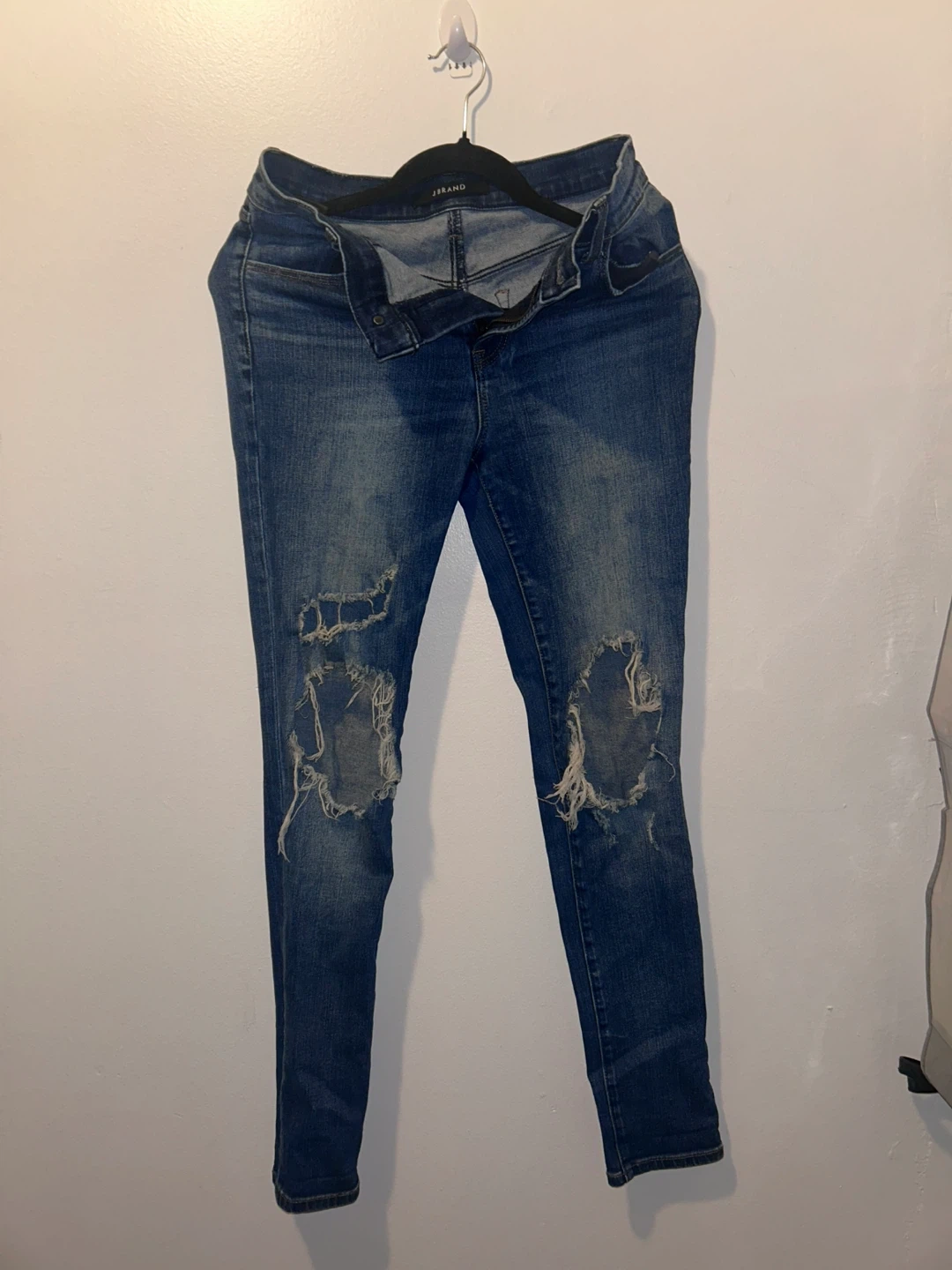 10distressed blue jeans. They have a stylish, worn look with intentional rips and tears. Perfect for a casual, edgy style!